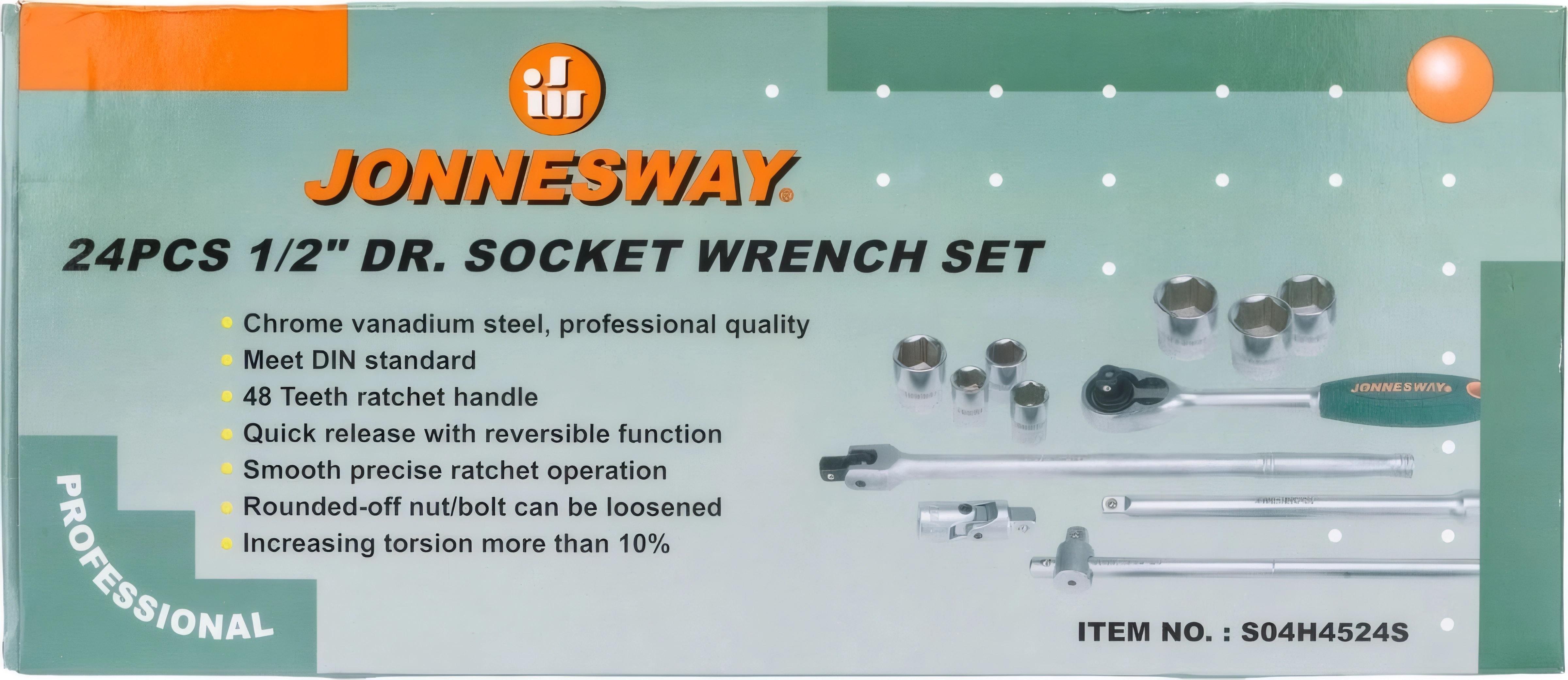 Набор инструментов Jonnesway S04H4524S (47433) - 1/2 дюйма DR, 24 предмета, инструменты из хром-ванадиевой стали, металлический кейс с ручкой, пожизненная гарантия