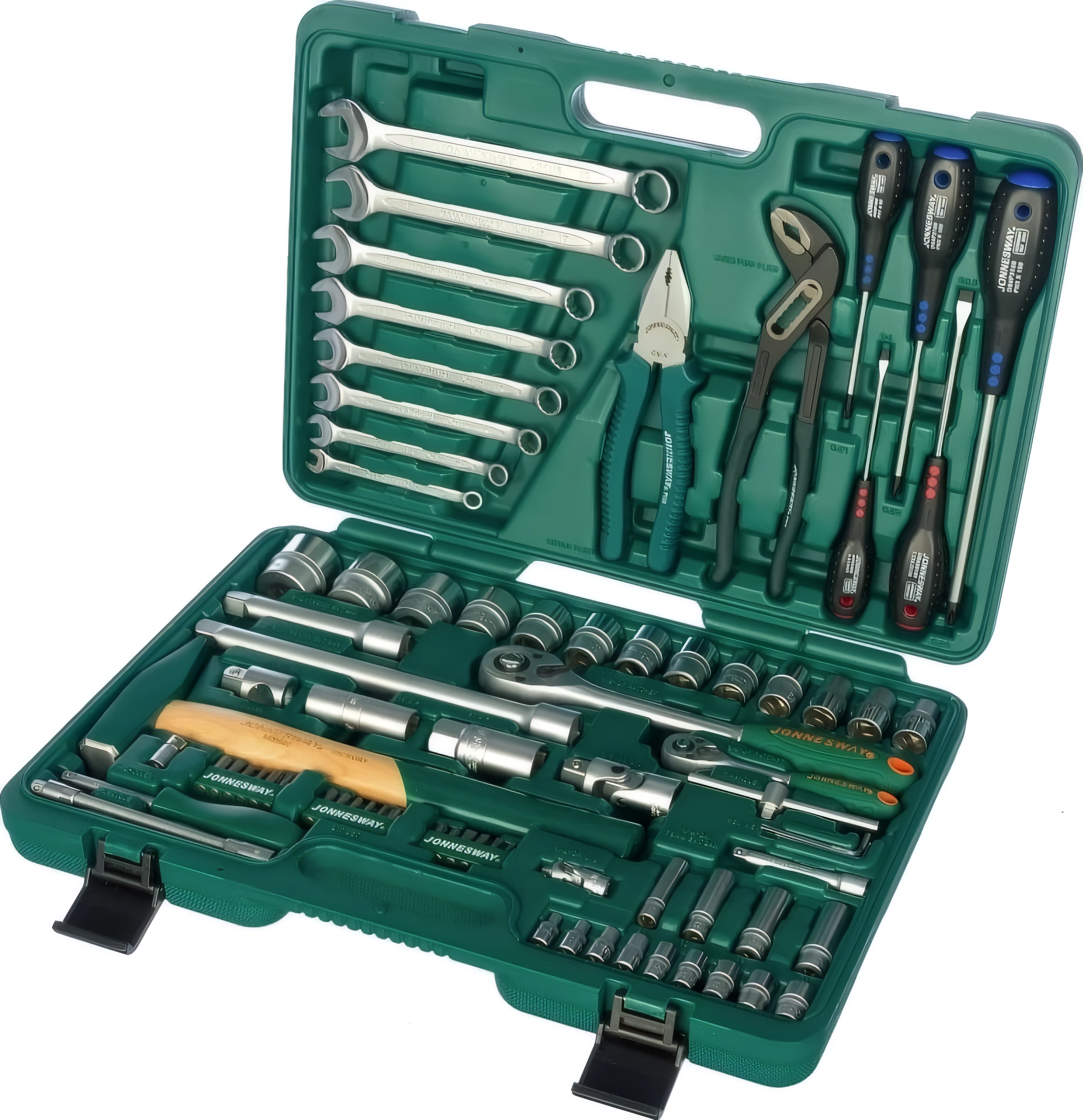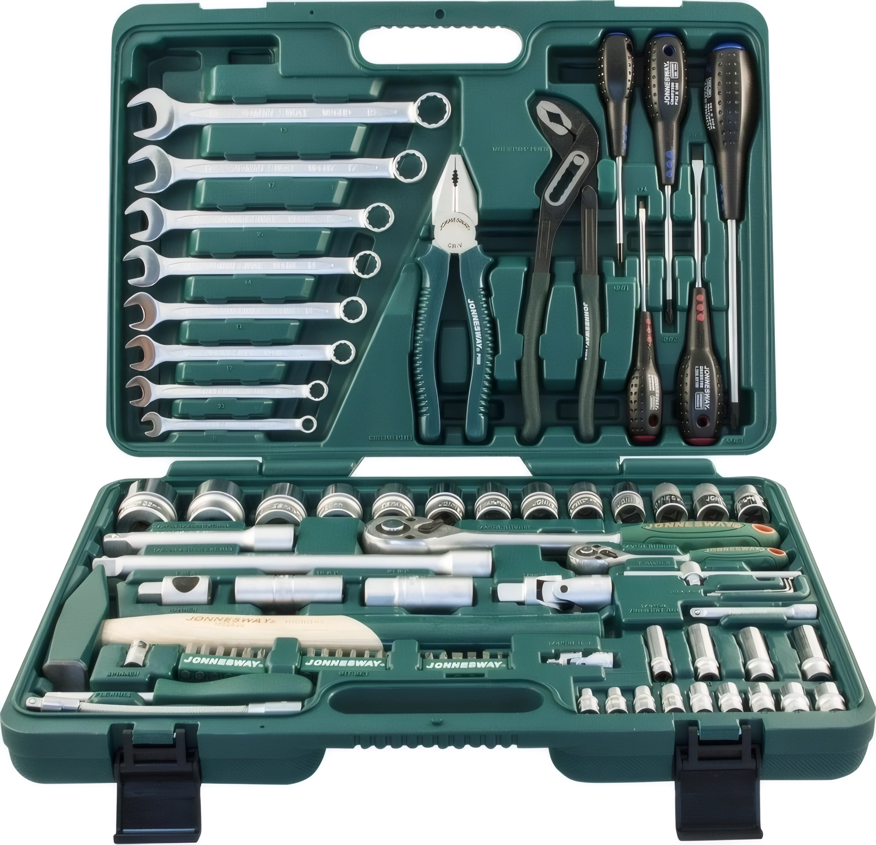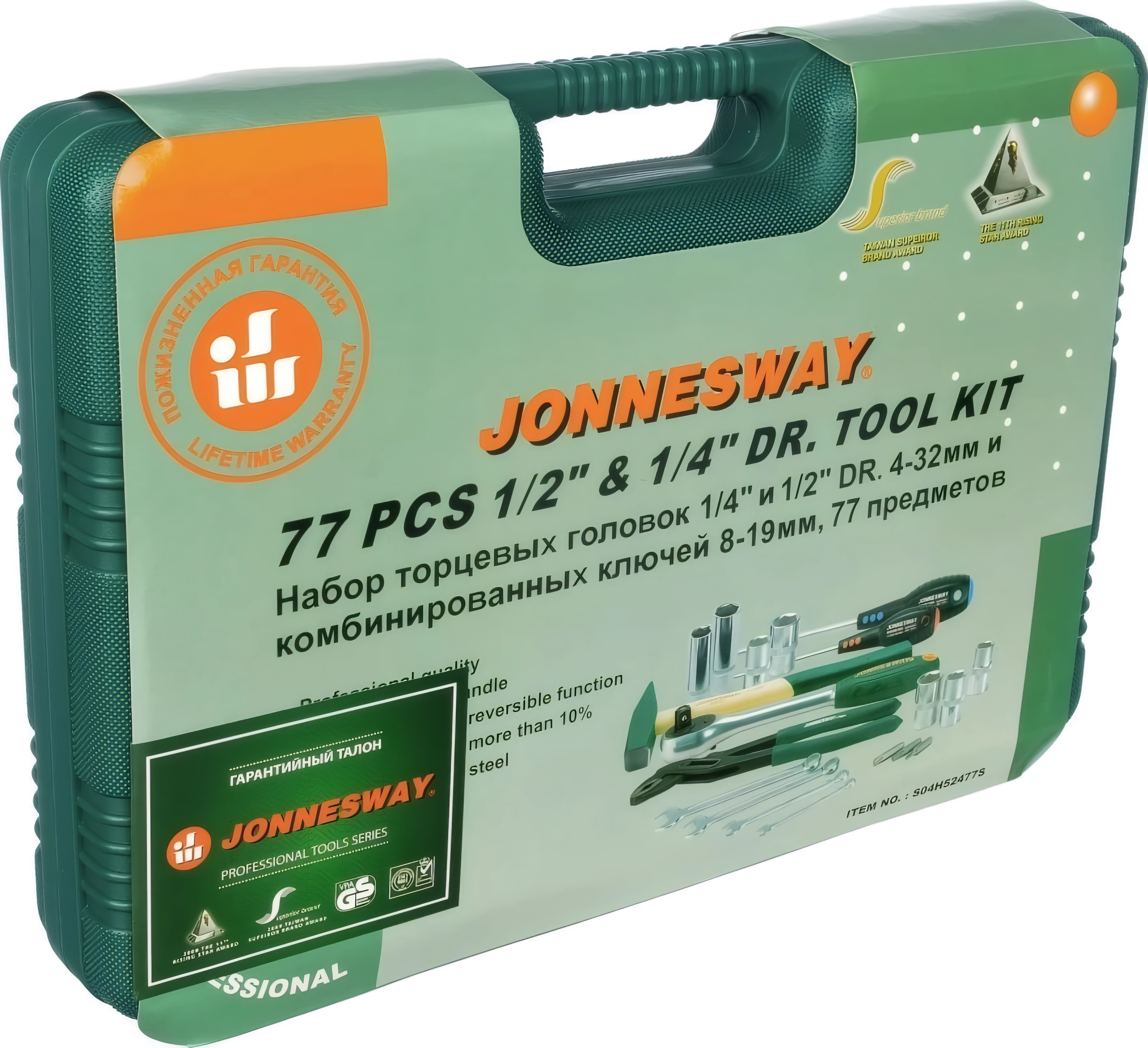 Набор инструментов Jonnesway S04H52477S (47567) - 77 предметов (головки 1/2 и 1/4 дюйма DR, отвертки, комбинированные ключи, пассатижи, молоток и др.), пожизненная гарантия, кейс в комплекте