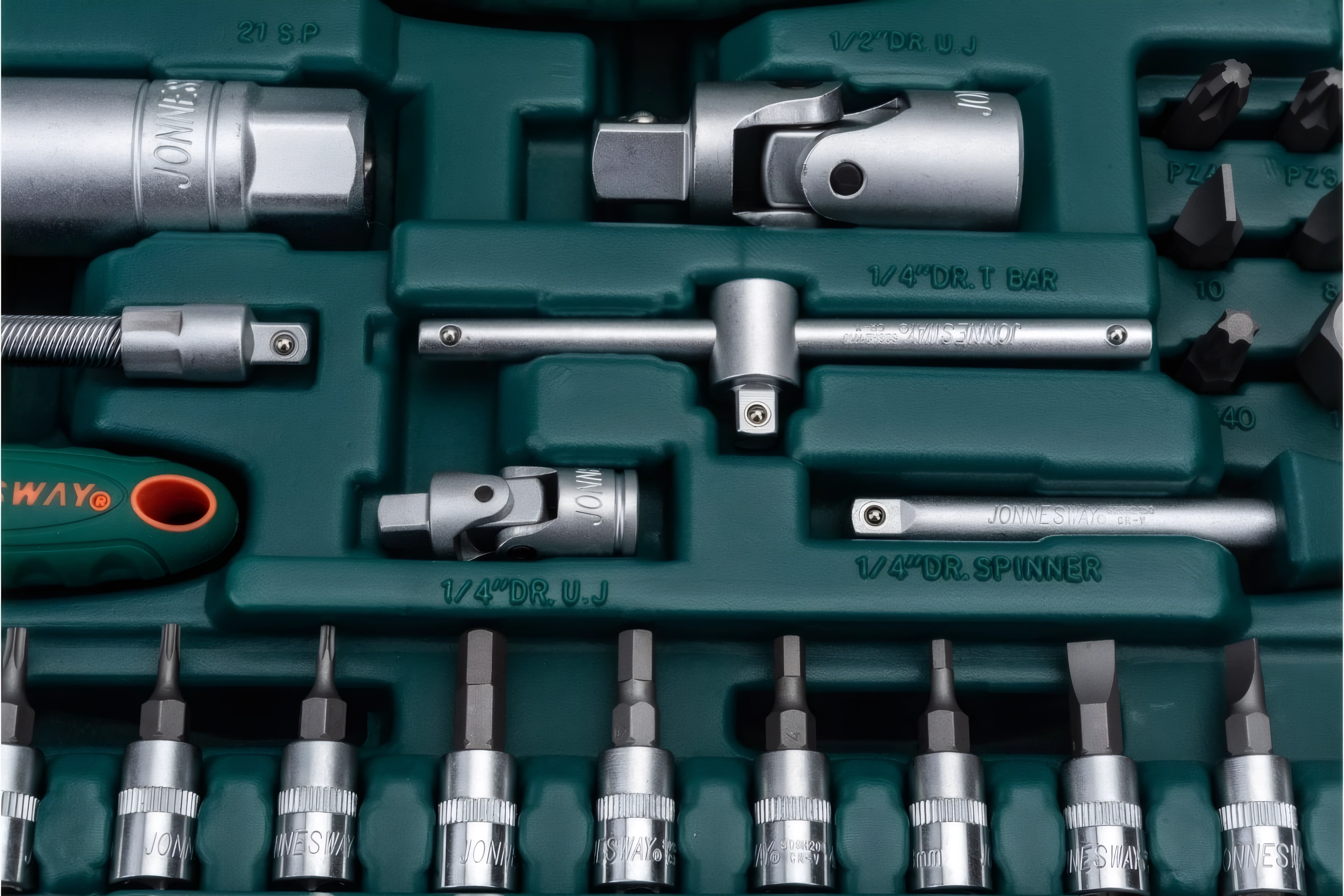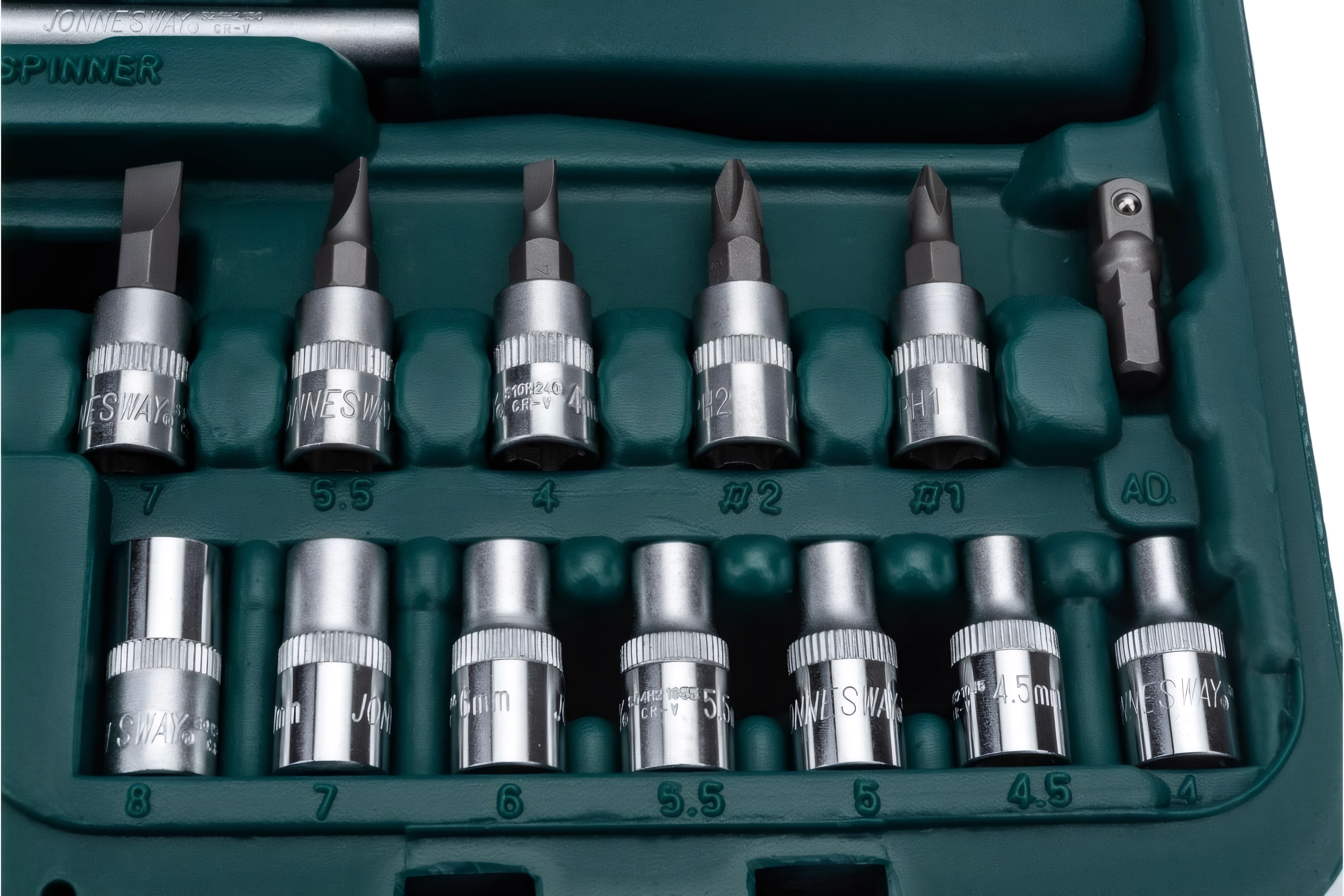 Набор инструментов Jonnesway S04H52482S - размеры 1/2 и 1/4 дюйма DR, страна-производитель - Тайвань, пожизненная гарантия, кейс в комплекте