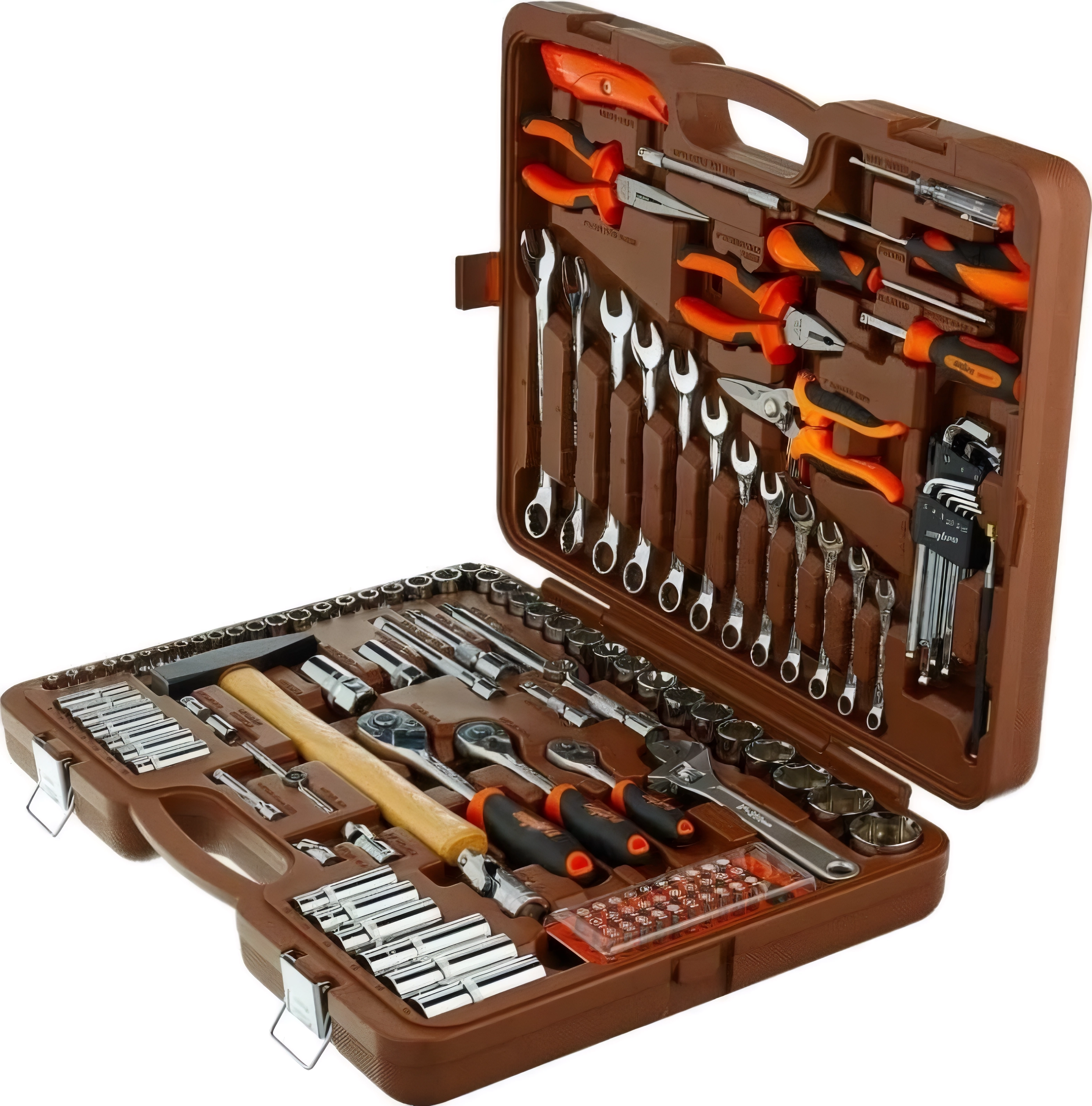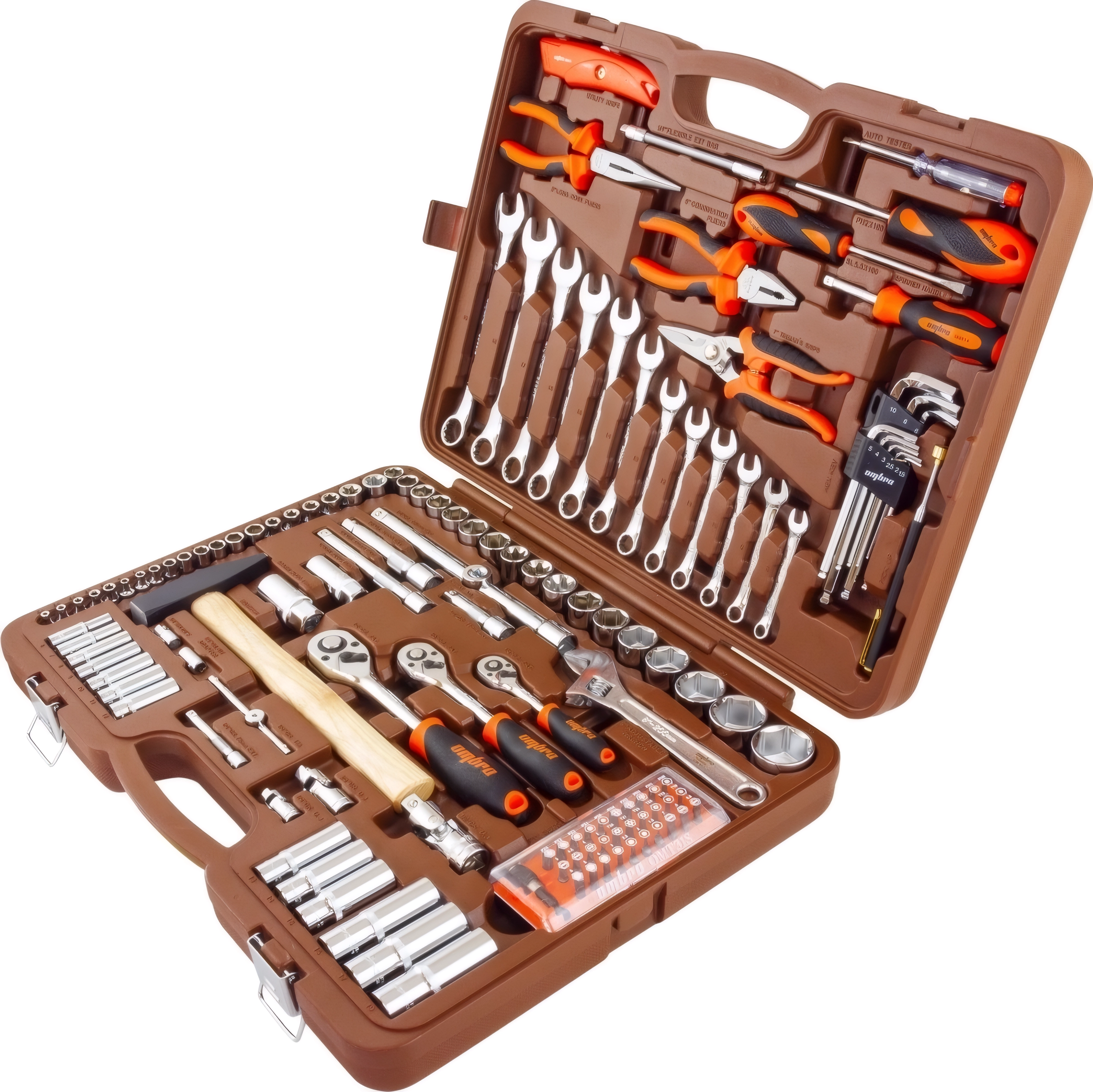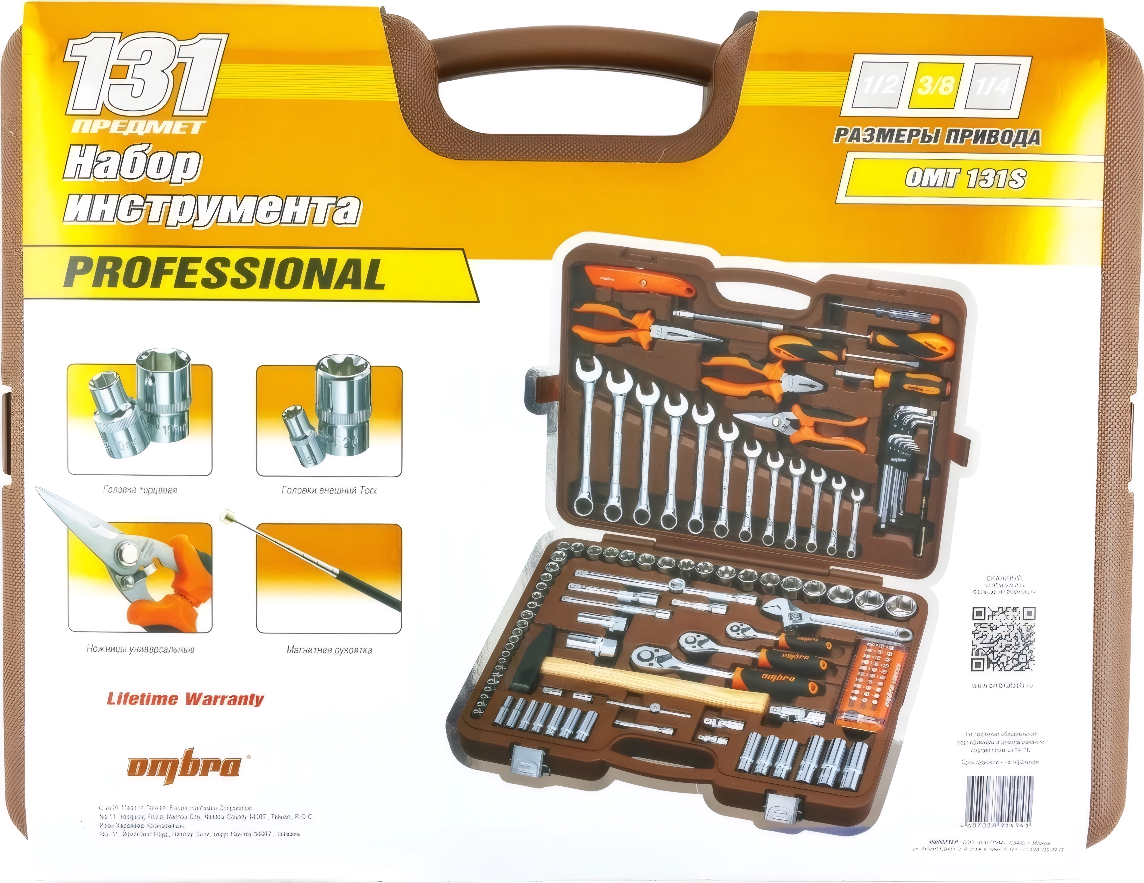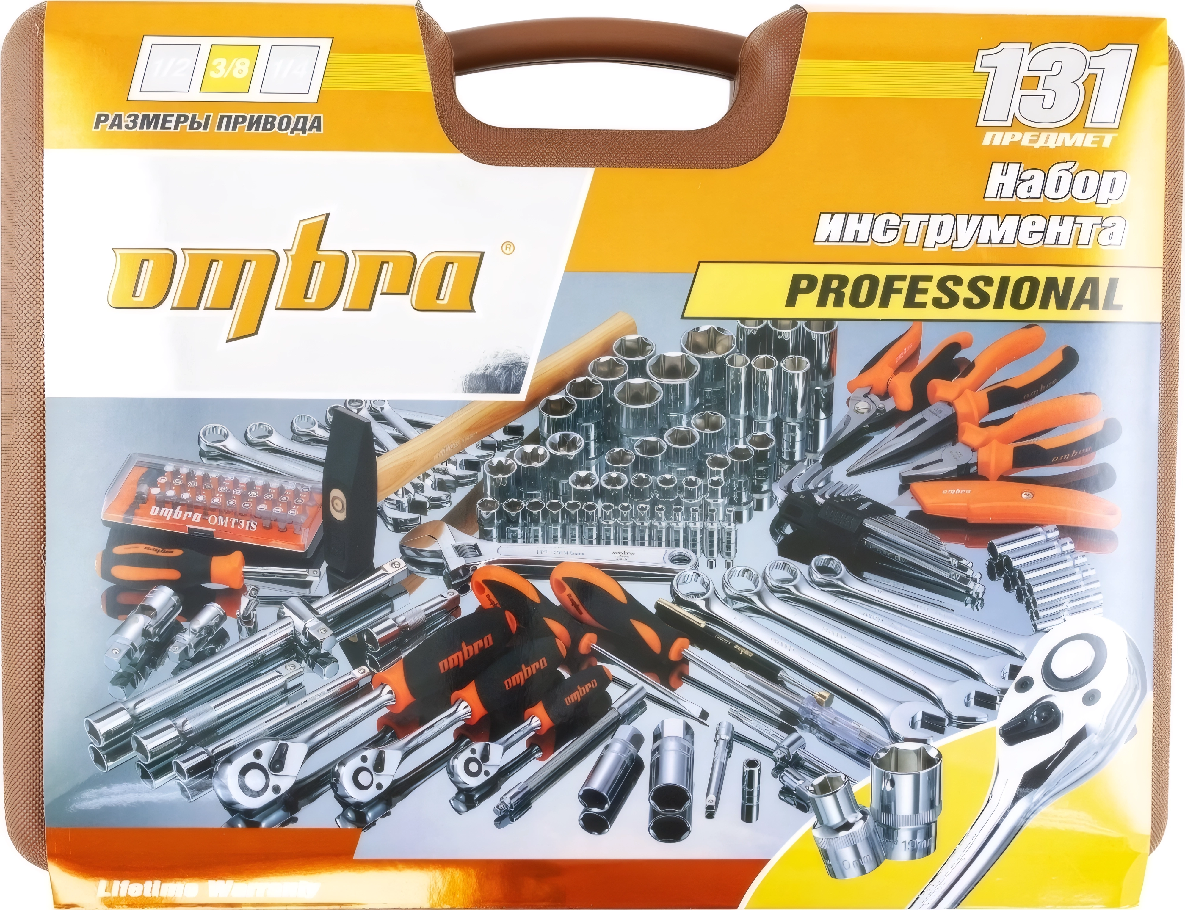 Набор инструментов Ombra OMT131S (55013) - 131 предмет, посадочные размеры 1/2, 3/8, 1/4 дюйма DR, пластиковый кейс, торцевые головки, комбинированные ключи, пассатижи, молоток