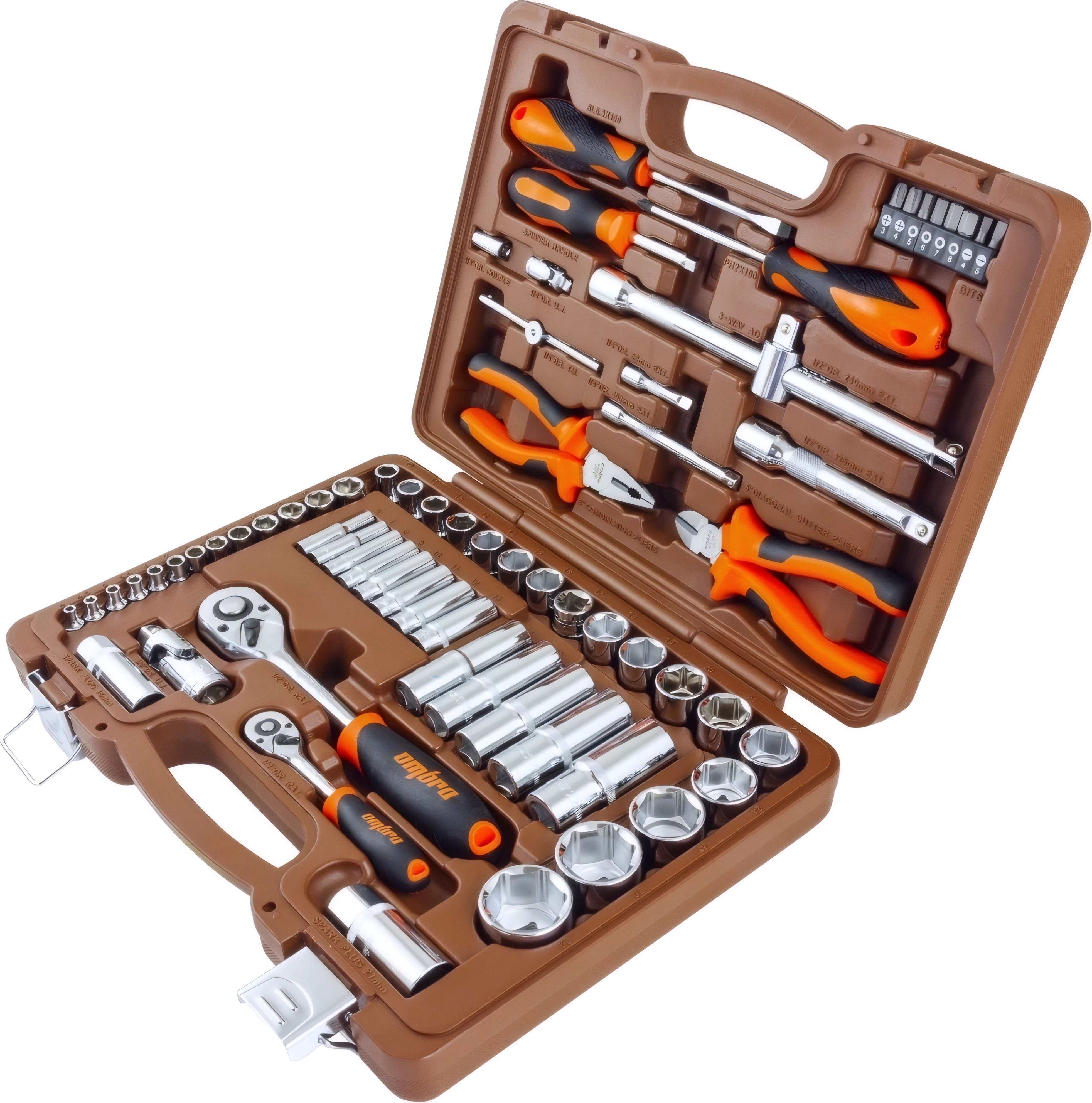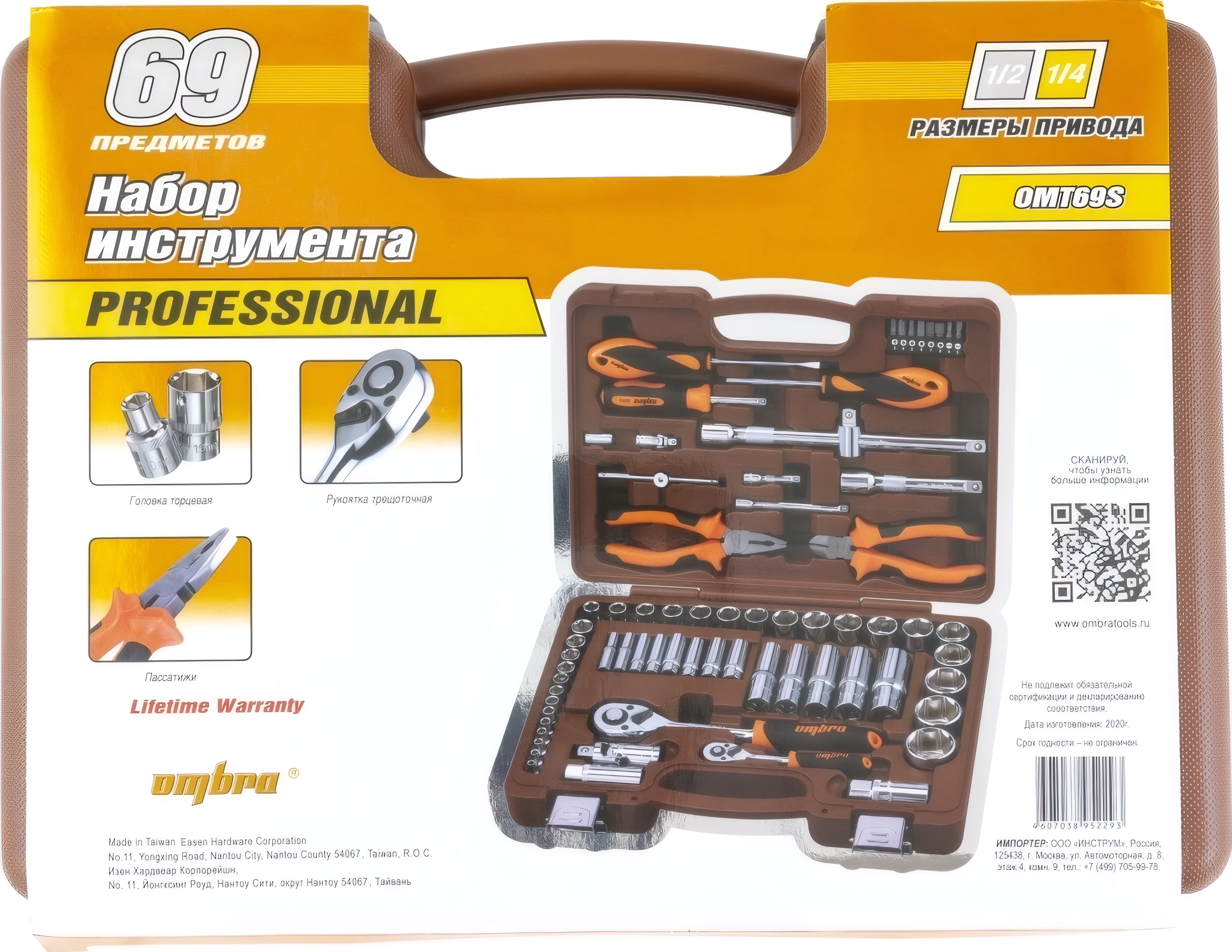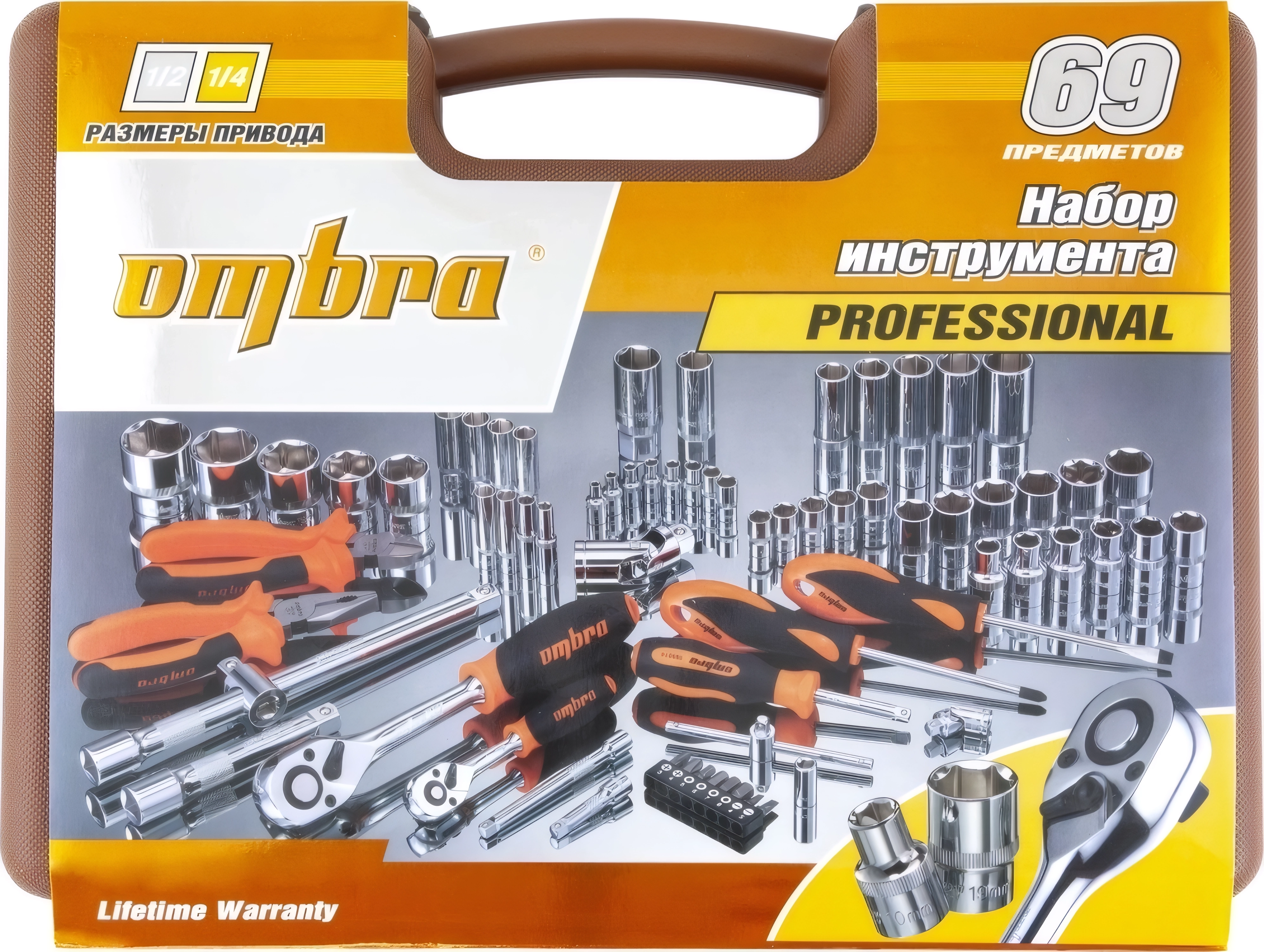 Набор инструментов Ombra OMT69S (55004) - 69 предметов, посадочные размеры 1/2 и 1/4 дюйма DR, пластиковый кейс, торцевые головки, комбинированные ключи, пассатижи, пожизненная гарантия, произведен в Тайвани