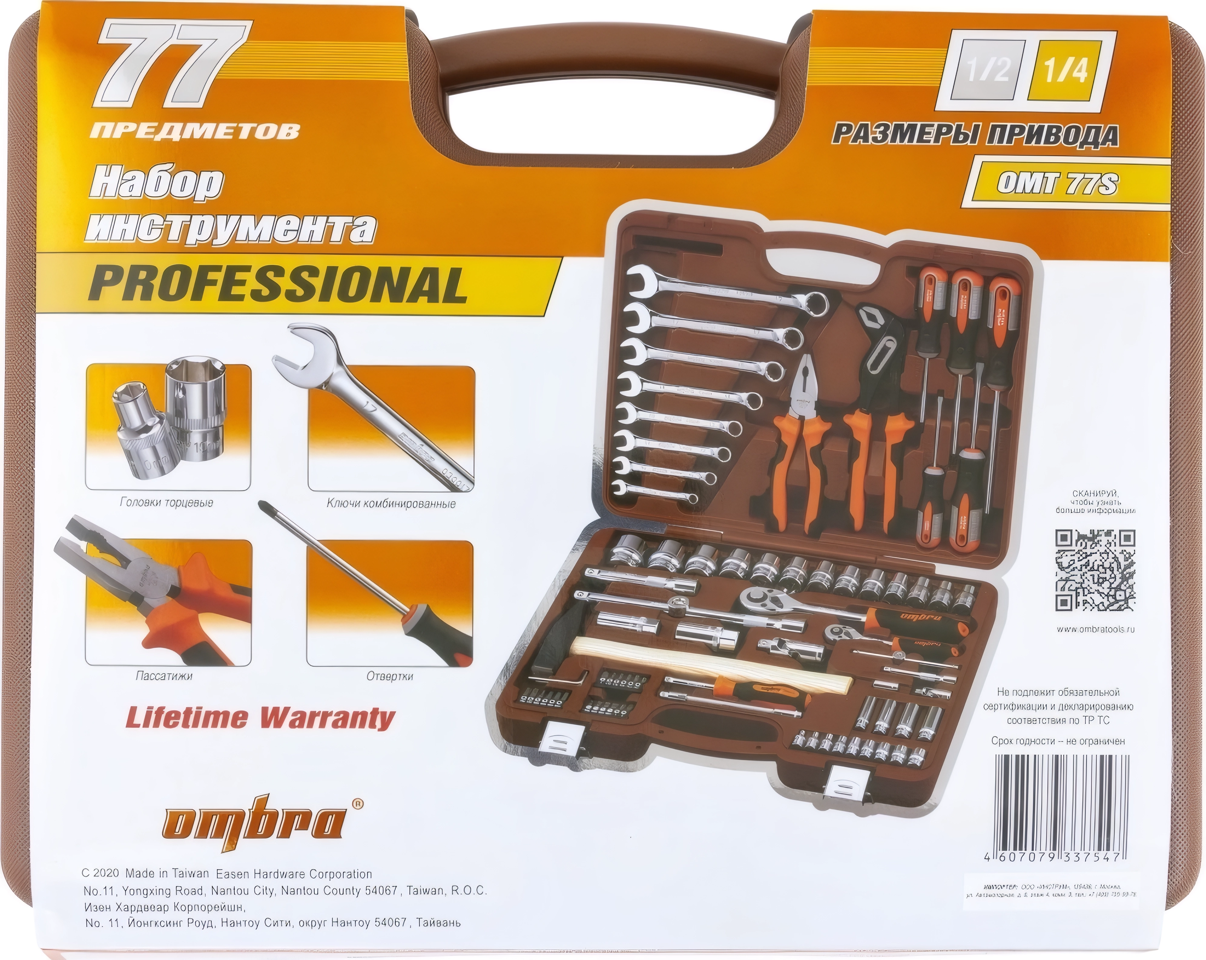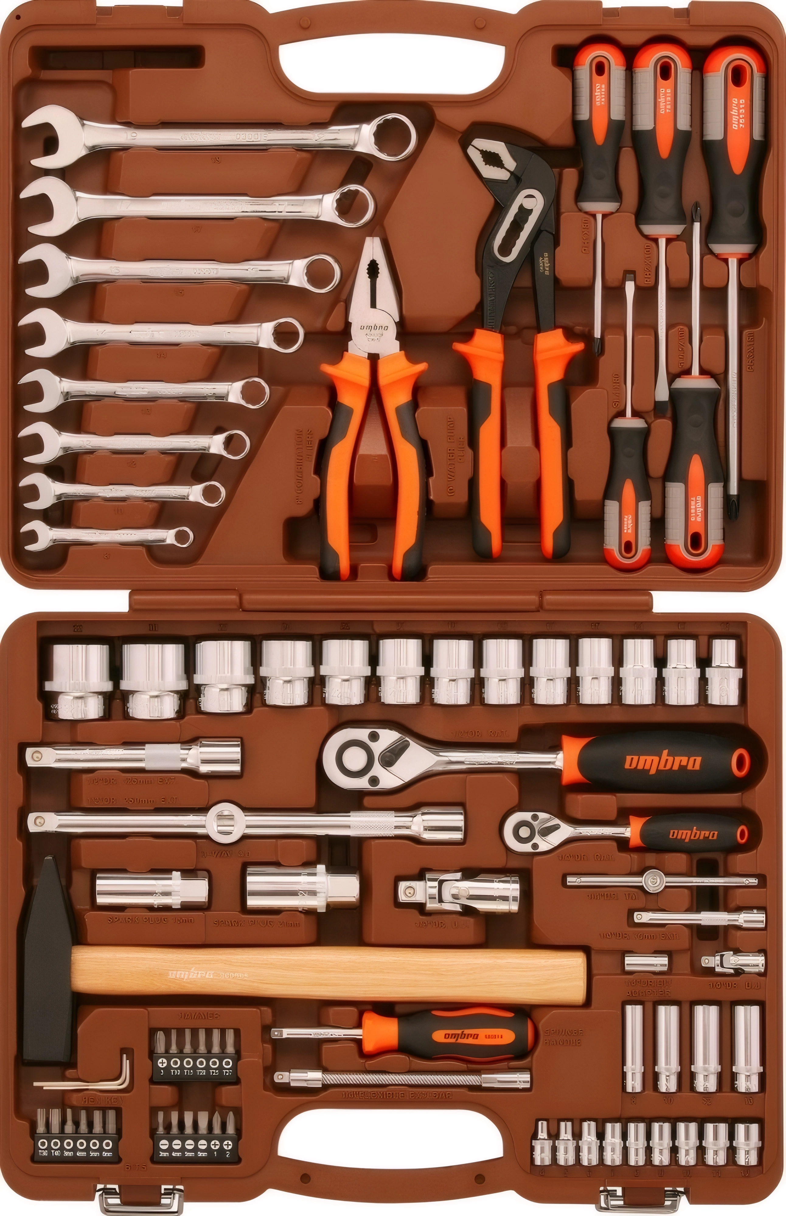 Набор инструментов Ombra OMT77S (55436) - 77 предметов, посадочные размеры 1/2 и 1/4 дюйма DR, пластиковый кейс-ложемент, торцевые головки, комбинированные ключи, пассатижи, молоток, пожизненная гарантия