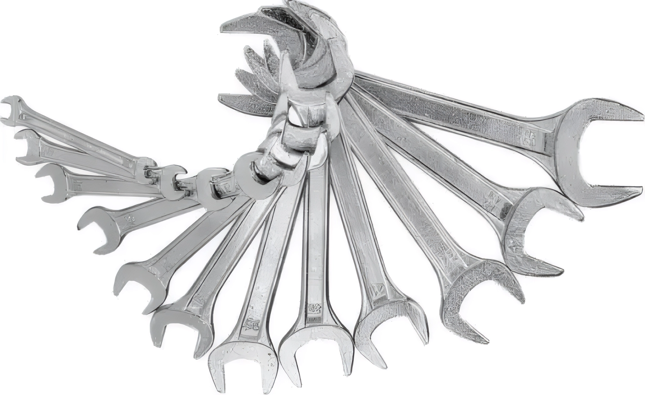 Набор комбинированных ключей применяется для работы с крепежом различных размеров при ремонте автомобиля или в бытовых условиях.