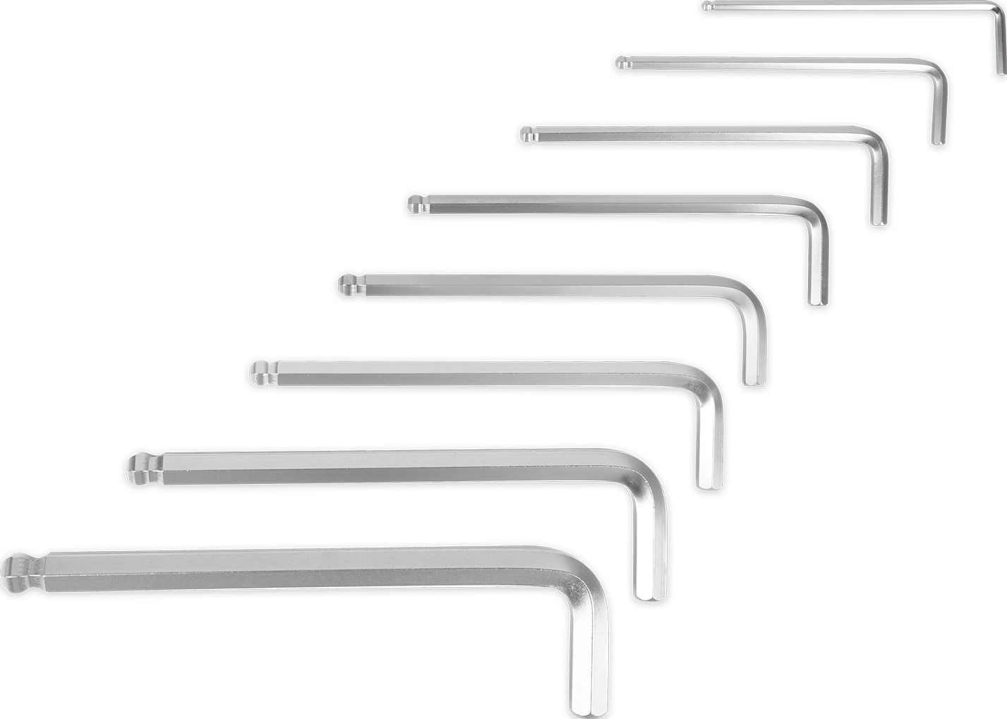 Набор состоит из Г-образных шестигранных шаровых ключей, в пластиковом держателе. Предназначен для работы с соединениями с шестигранным шлицем.