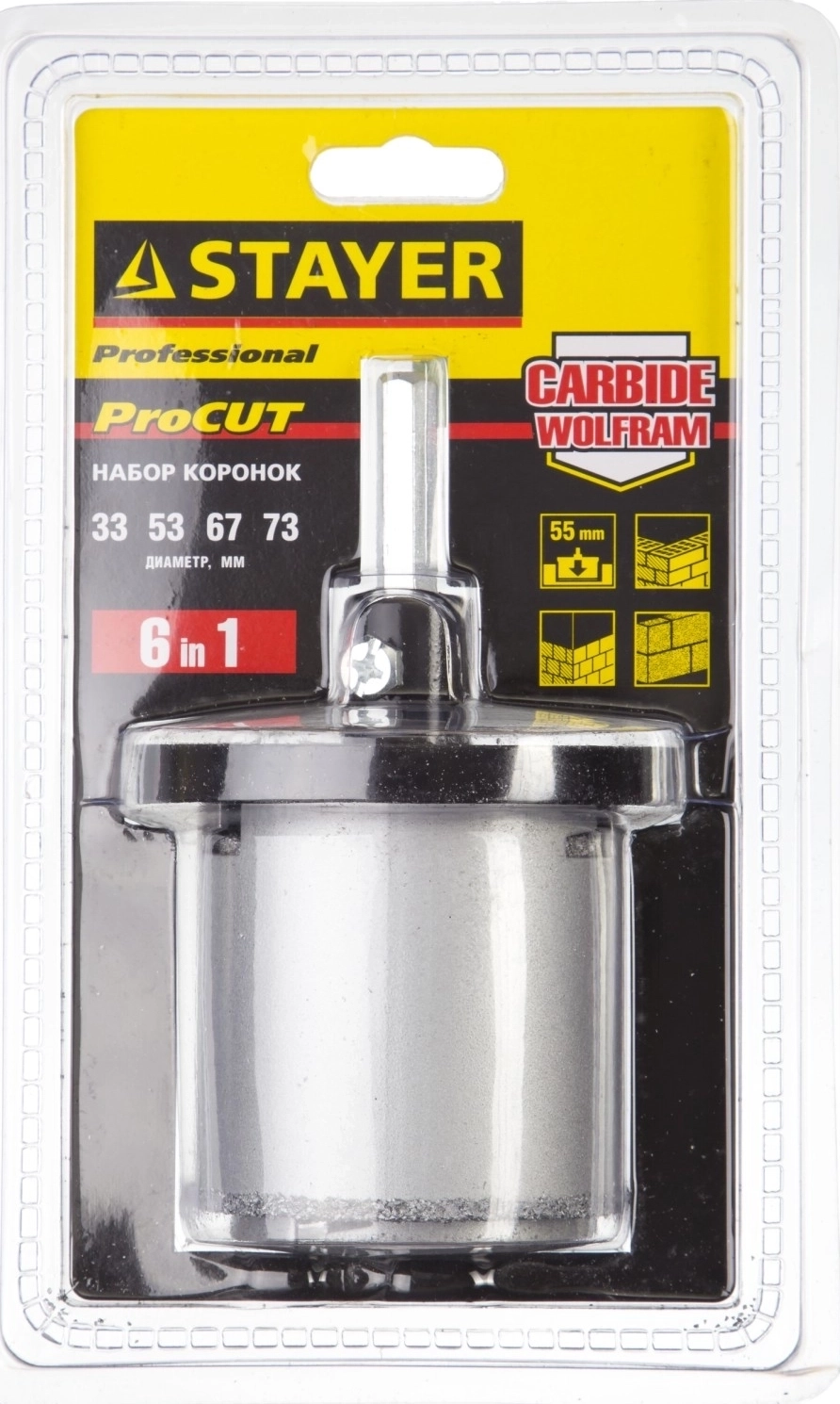 Комплектация: 6 пр.: коронки 33 - 53 - 67 - 73 мм, универсальное основание, центрирующее сверло