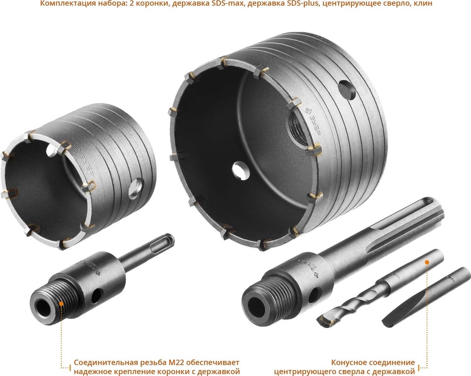 - Резьбовая посадка М22 обеспечивает надежное крепление коронки с державкой
