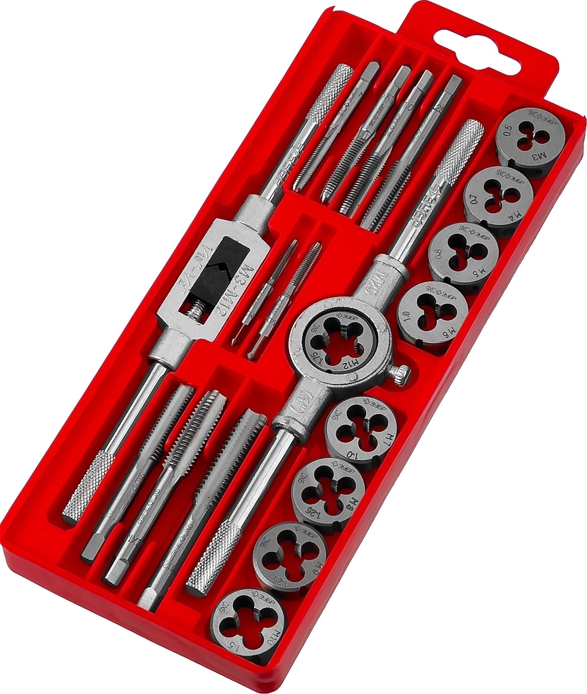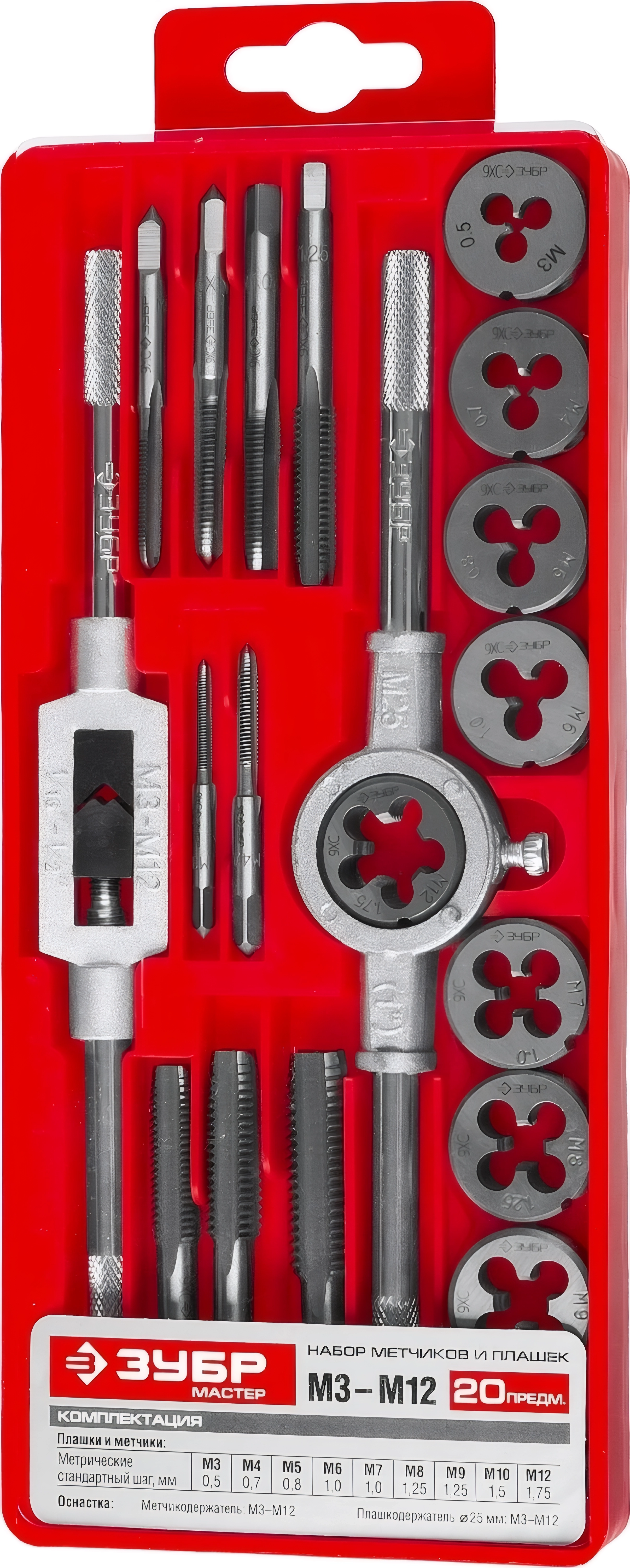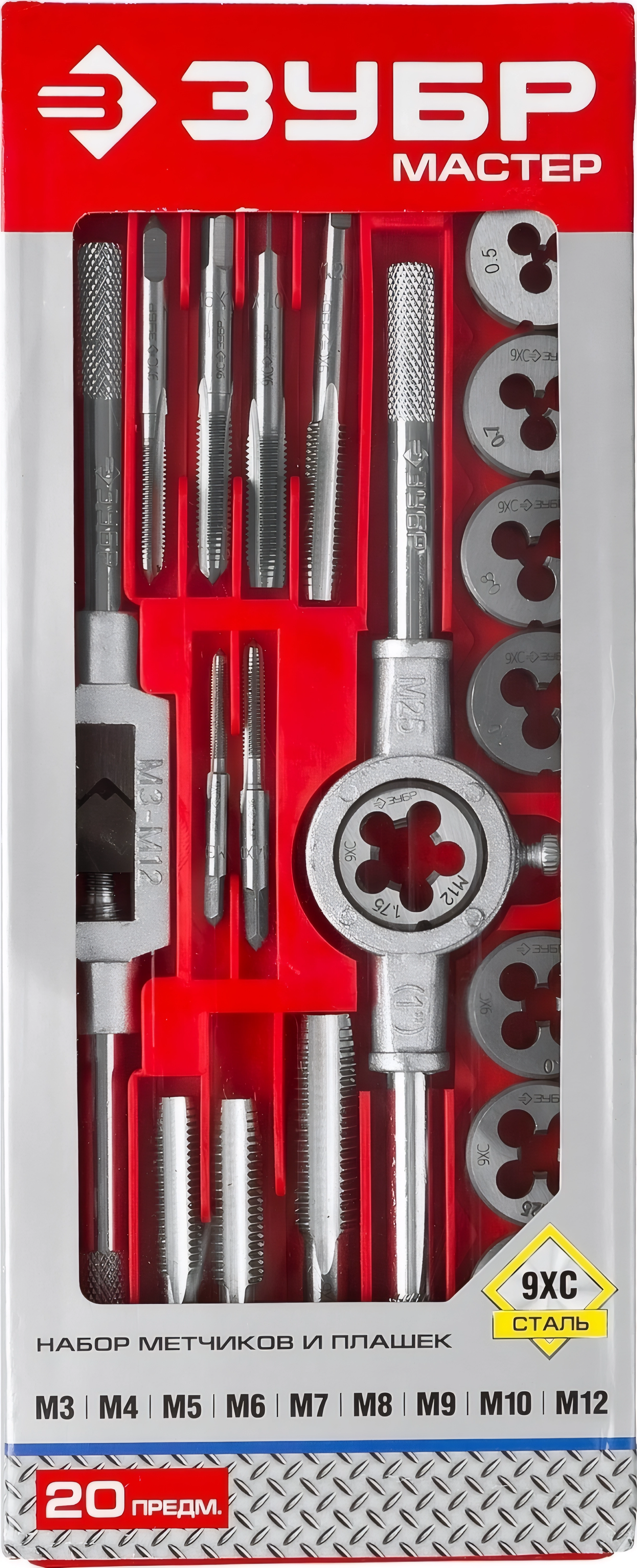 Набор метчиков и плашек в пластиковом боксе ЗУБР 20 предм., сталь 9ХС