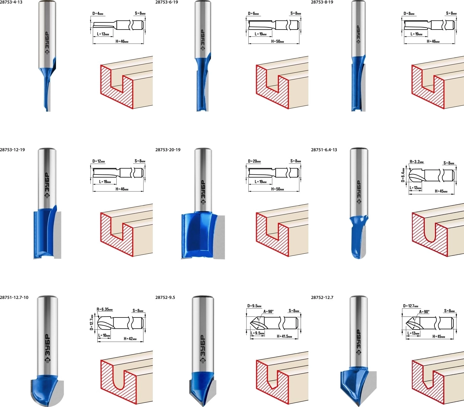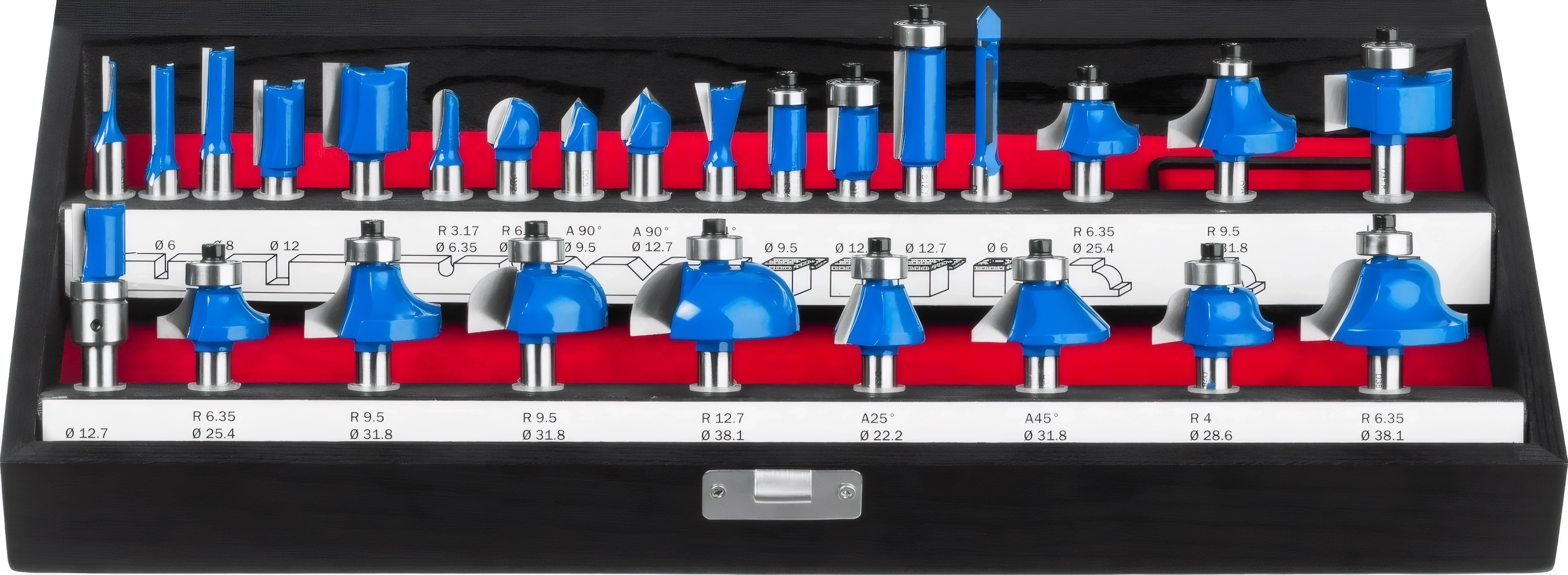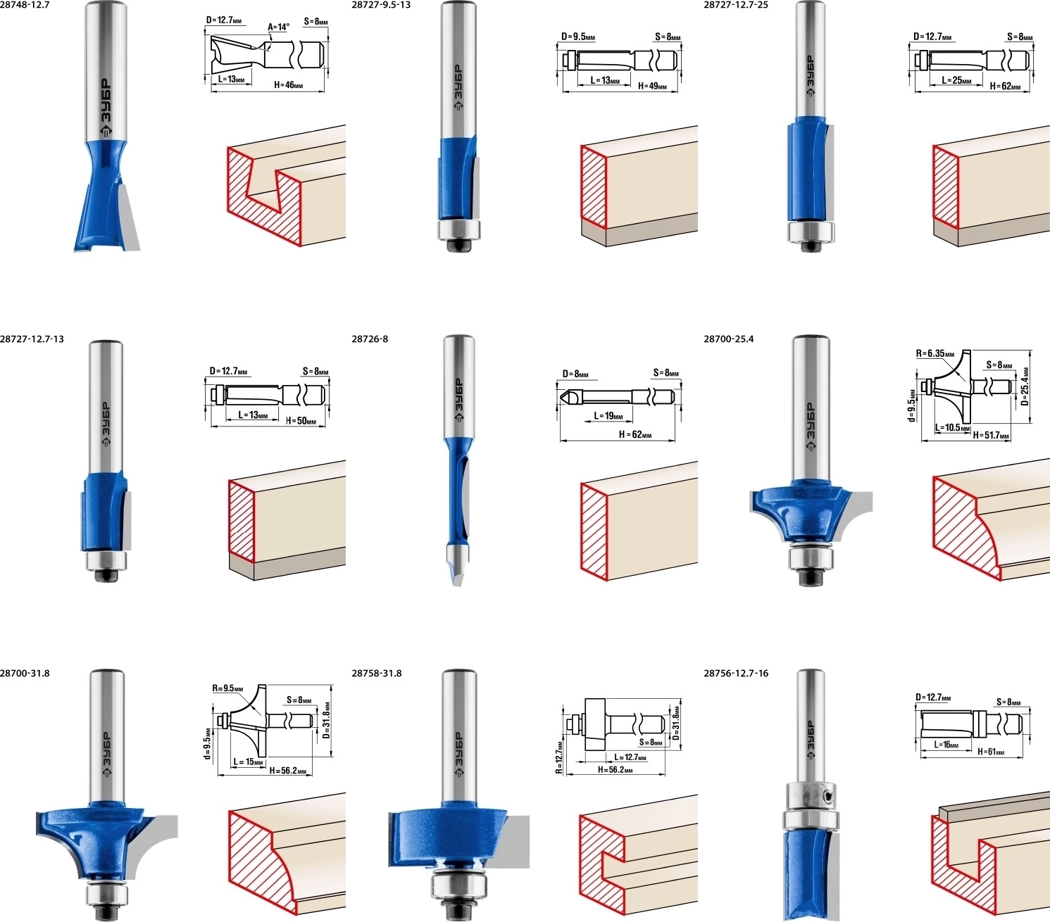 Набор фрез отлично подходит для профилирования кромок, изготовления декоративных пазов и рисунков, фрезерования канавок при работе с различными видами древесины.