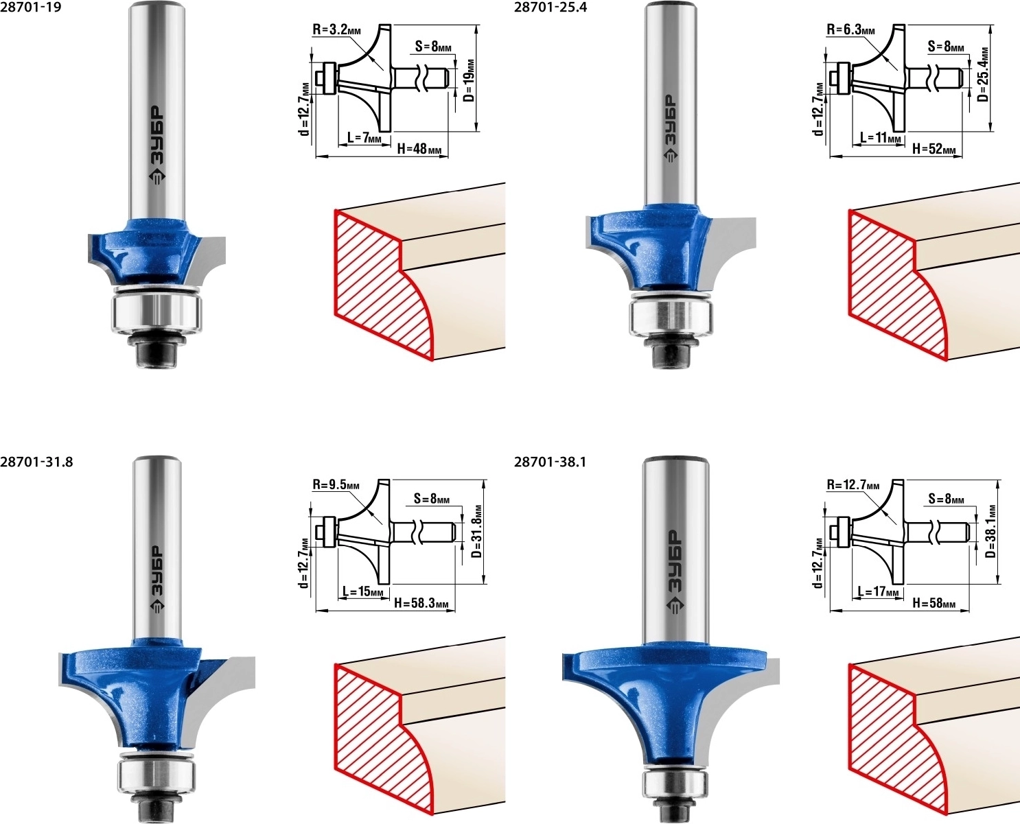 Набор профильных фрез по дереву ЗУБР 4 шт