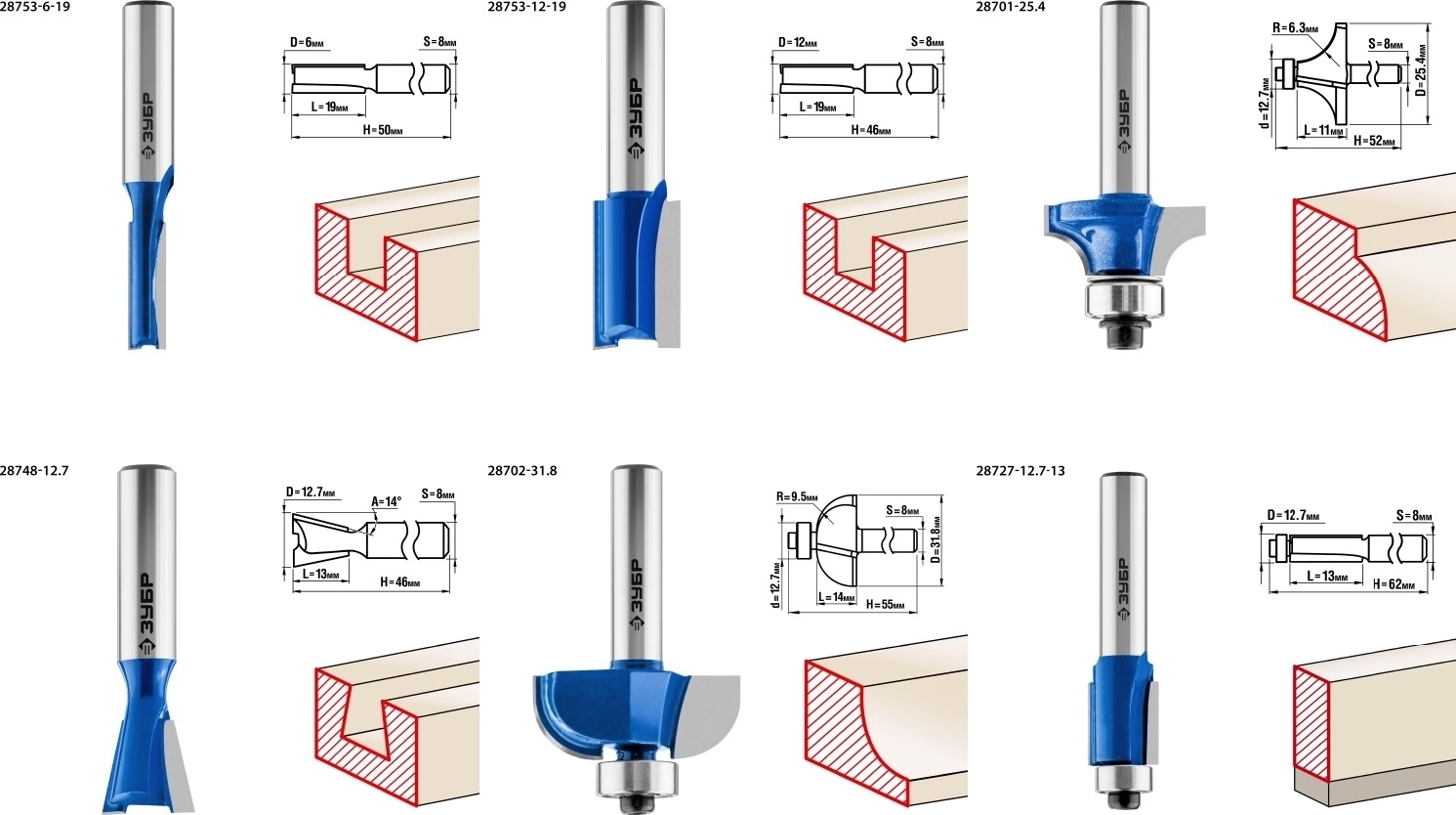 Набор профильных фрез по дереву ЗУБР 6 шт