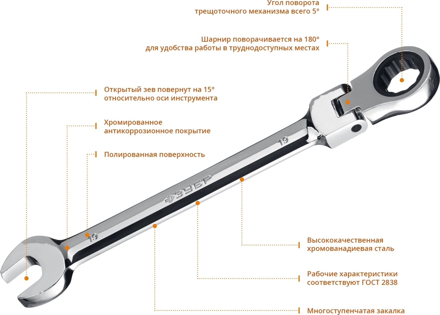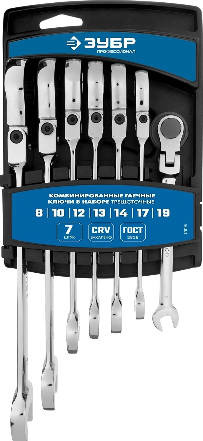 Набор шарнирных трещоточных гаечных ключей ЗУБР 7 шт 8 - 19 мм