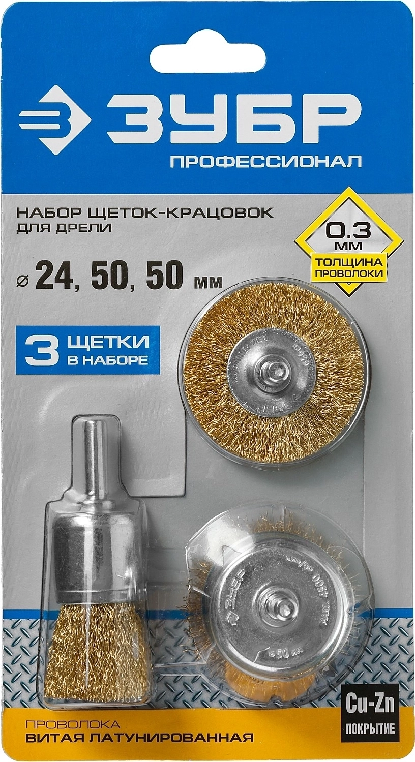 Набор щеток для дрели ЗУБР d 24/50/50 мм витая стальная латунированная проволока 0.3 мм