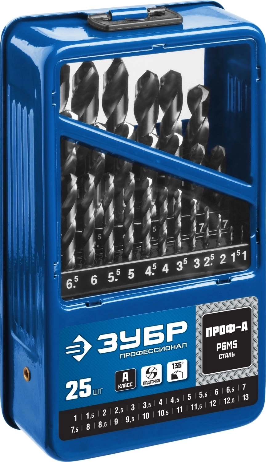 Набор сверл по металлу ЗУБР ПРОФ-А 25 шт 1-13 мм сталь Р6М5 класс А мет.бокс