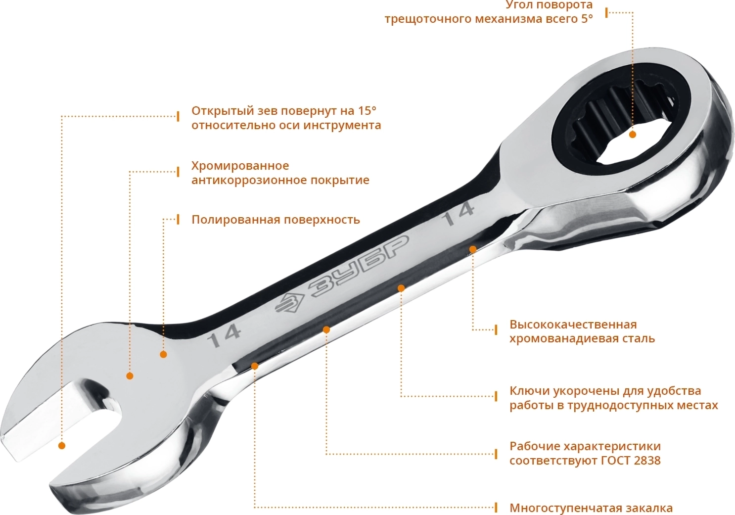 Набор укороченных трещоточных гаечных ключей ЗУБР 8 - 14 мм 5 шт