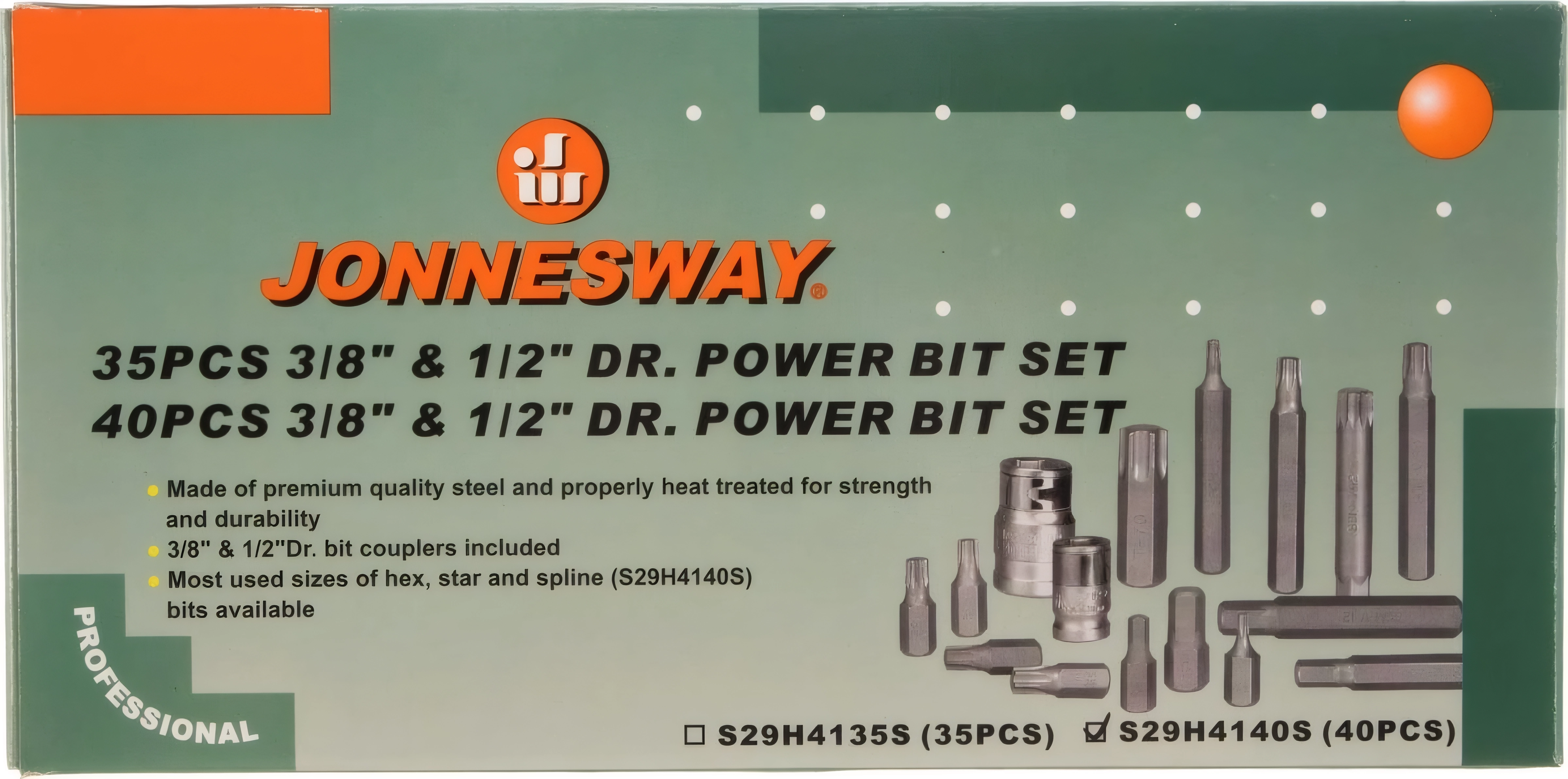 Набор вставок-бит 10 мм H4-12 мм, Т20-Т55, M5-M12 (30 и 75 мм.), 3/8"DR и 1/2"DR, 40 предметов JONNESWAY S29H4140S