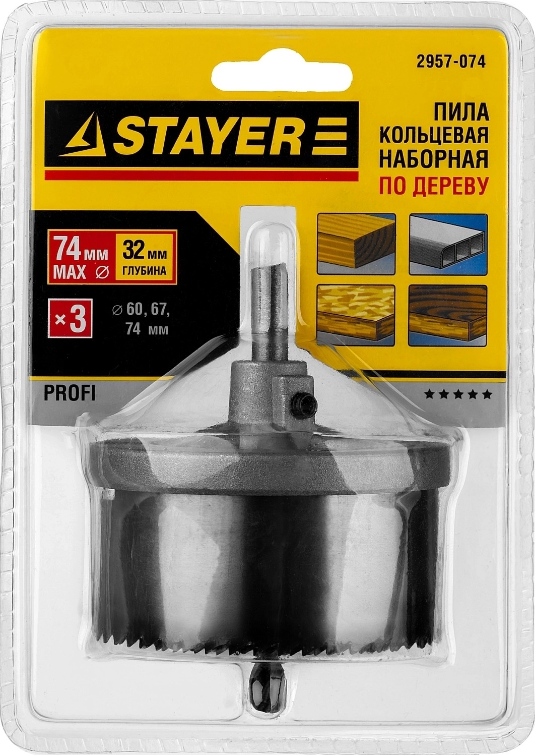 Наборная кольцевая пила по дереву Professional STAYER 3 шт (60-67-74 х 32 мм) усиленная