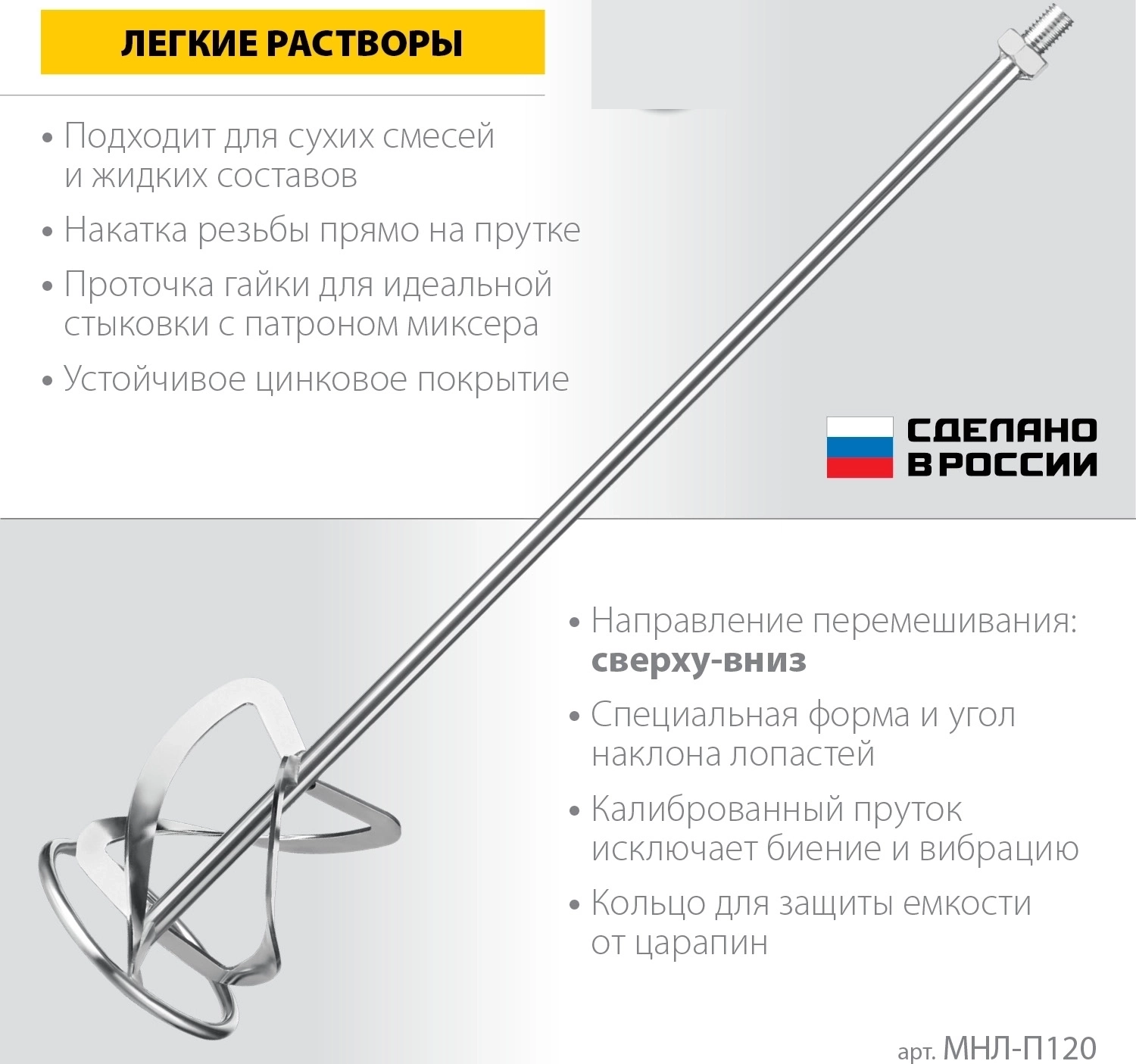 Насадка с лопастями для перемешивания легких растворов (краска, грунтовка, штукатурка, наливной пол, затирка). Используется совместно с ручными миксерами ЗУБР ЗМР-1200Э-1, МР-1050-1, МР-1100, МР-1400-2 и МР-1600-2. Не поддается коррозии и не деформируется даже при эксплуатации в тяжелых условиях. Сделано в России