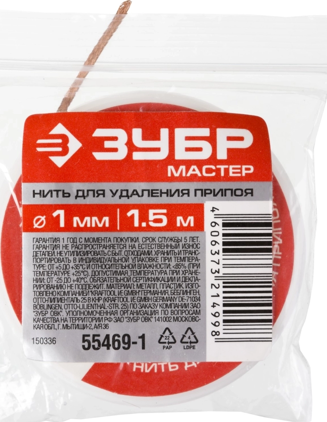 Нить для удаления излишков припоя ЗУБР диаметр 1 мм, длина 1.5 м