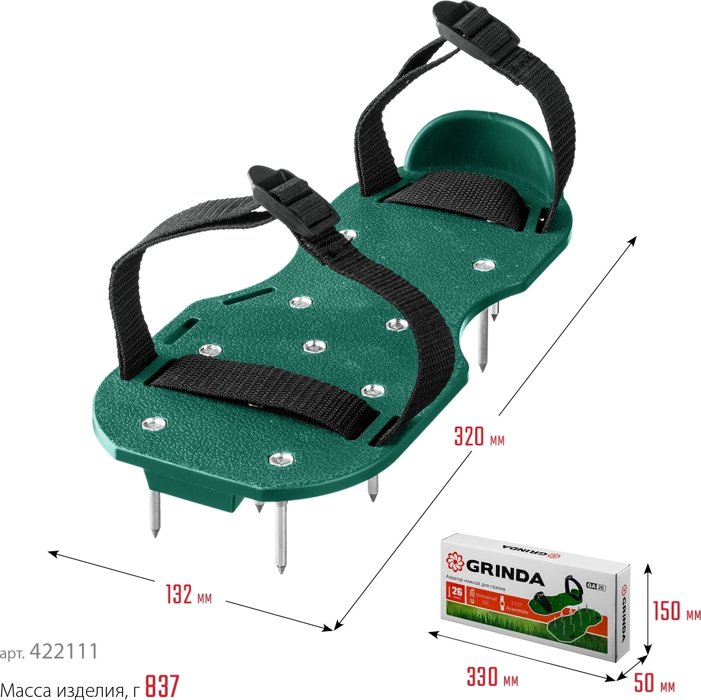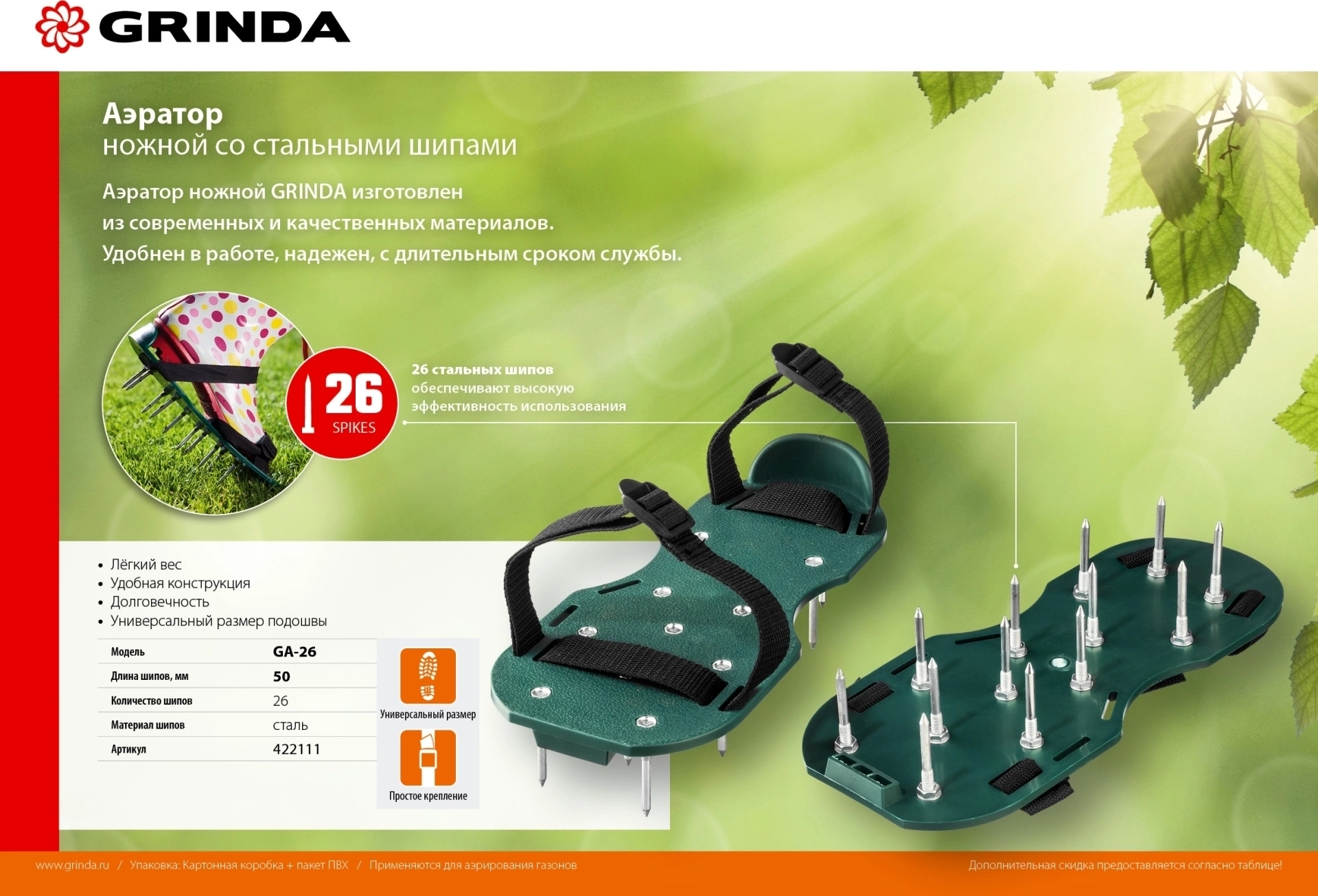 Ножной аэратор GRINDA GA-26, 26 стальных шипов, длина 50 мм, для газона