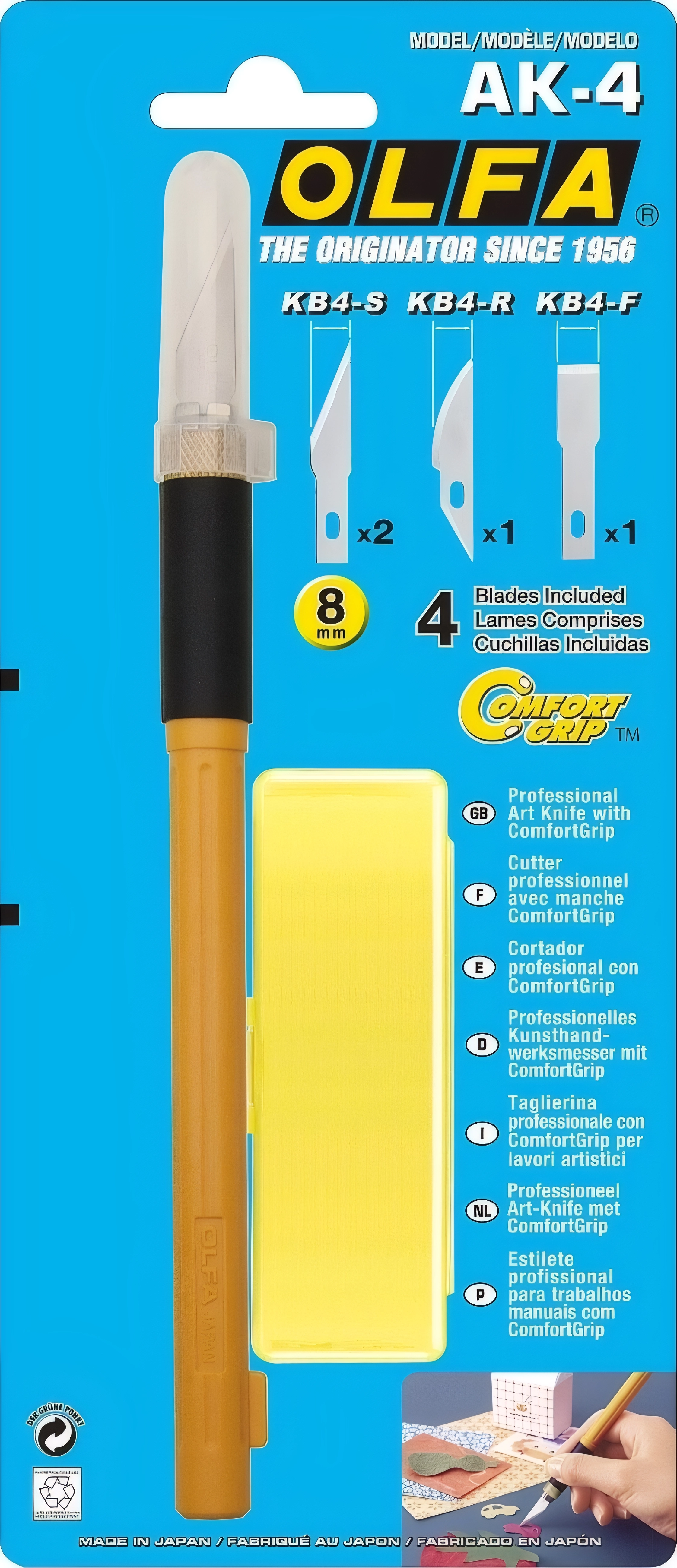 Профессиональный художественный нож OLFA AK-4 с рукояткой ComfortGrip и функцией быстрой смены лезвия обладает идеально продуманным дизайном и устройством стабилизации. Удобно лежит в руке, что обеспечивает наилучшее качество резки. Благодаря дополнительному весу в нижней части и механизму защиты от перекоса Вы можете безопасно и плавно завершить свой художественный проект. В комплект входят два прецизионных лезвия, одно зубило и одно изогнутое резное лезвие. Так что Вам больше не потребуется использовать несколько ножей, достаточно просто установить подходящее лезвие. Используется в мастерских и дизайн-студиях.