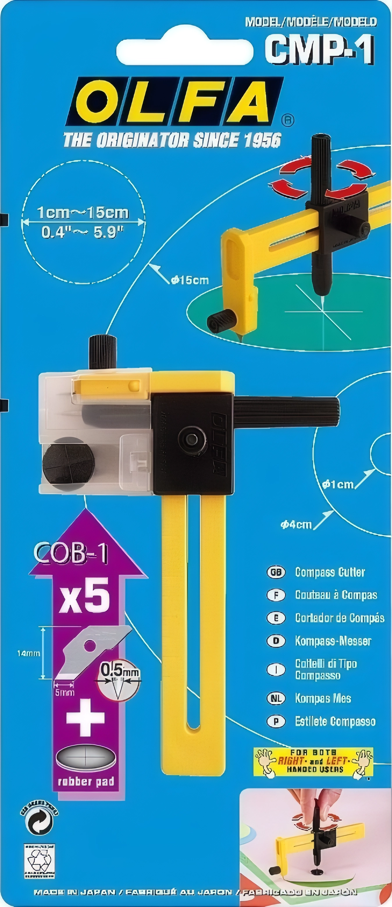 Циркульный резак OLFA CMP-1 идеально подходит для проектов связанных с вырезанием круглых поделок. Используйте резак, чтобы создавать круги из дерева или бумаги с высокой точностью. В ручке хранится 5 дополнительных лезвий. Предназначен для вырезания кругов диаметром от 10 до 150 мм.