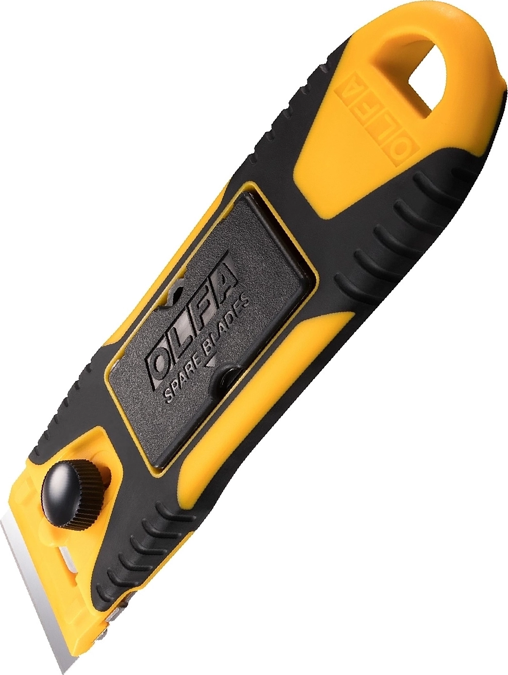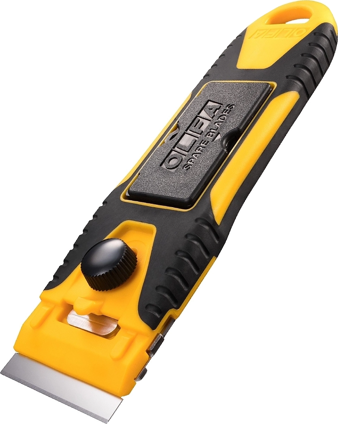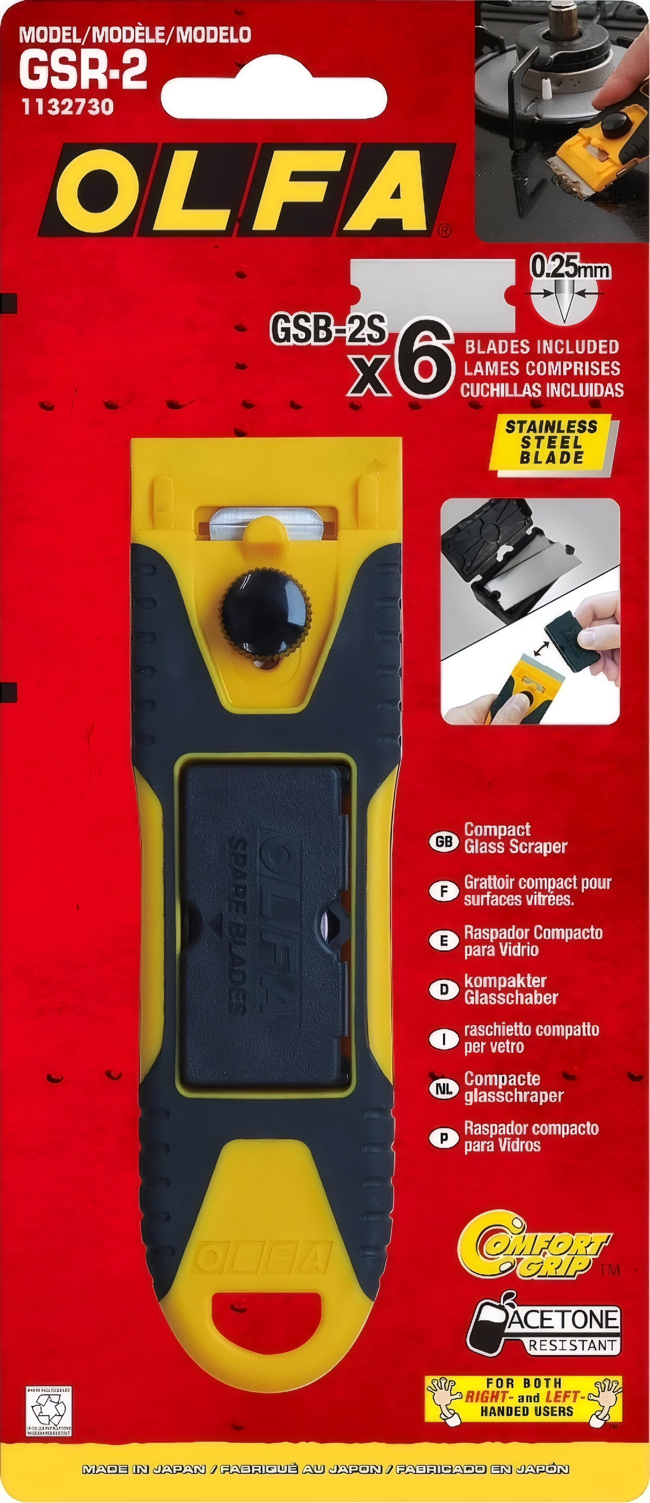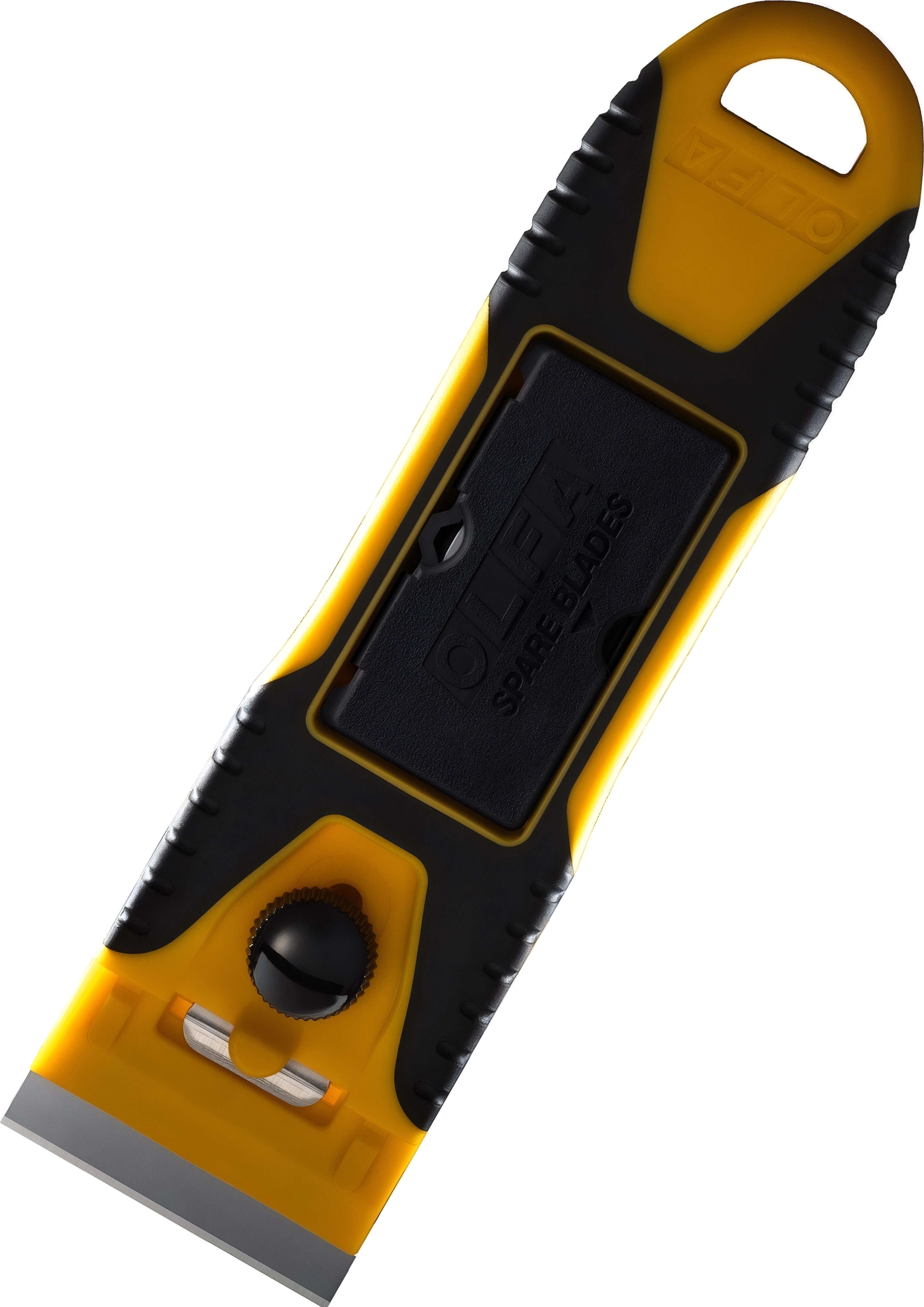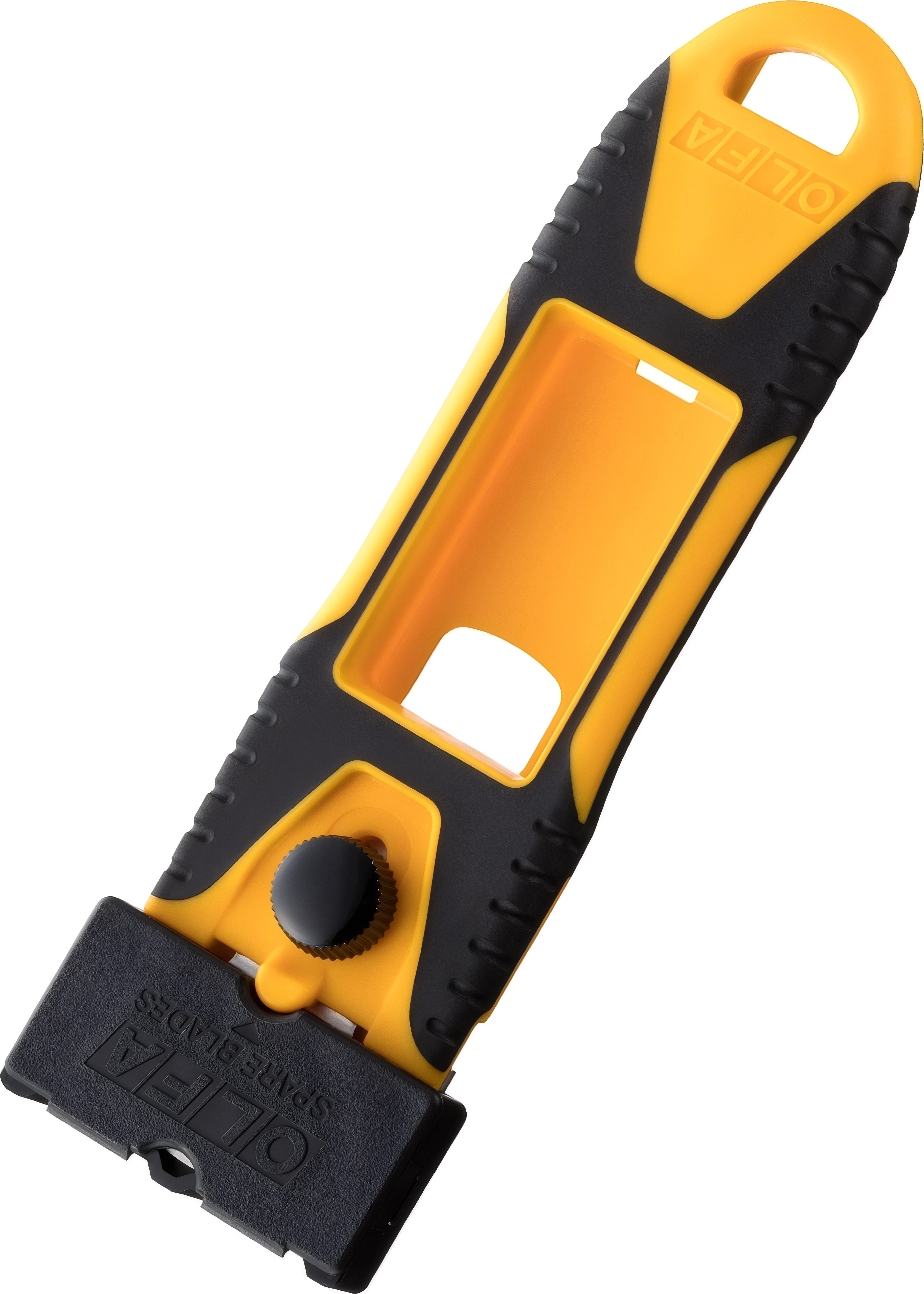 Компактный скребок OLFA GSR-2 удобен тем, что позволяет устранять загрязнения на небольшой площади в труднодоступных местах и на изогнутых поверхностях. Контейнер для лезвия можно использовать как защитную крышку для ножа.