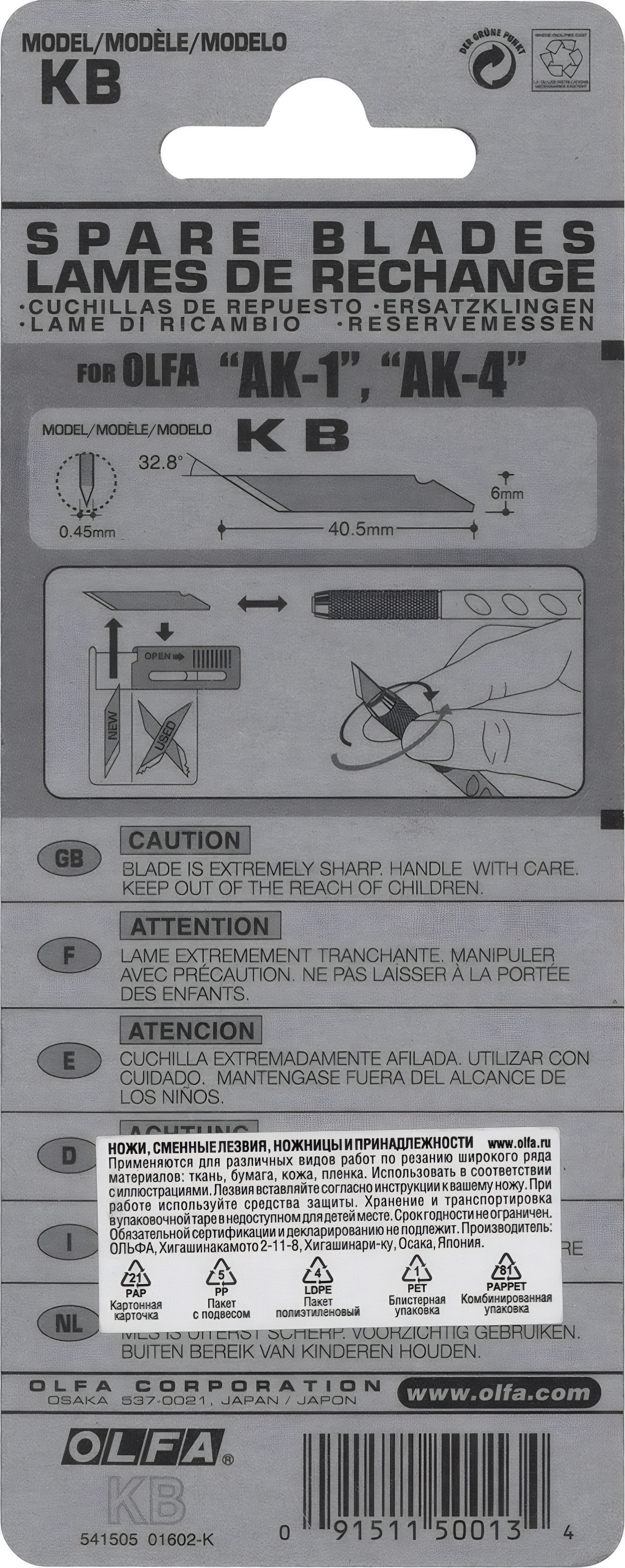 Используются в качестве сменных рабочих элементов в ножах OLFA AK-1/5B и AK-4 Применяются для фигурного вырезания, аппликаций, моделирования, разрезания бумаги, пленок, обоев, кожи и других видов работ.