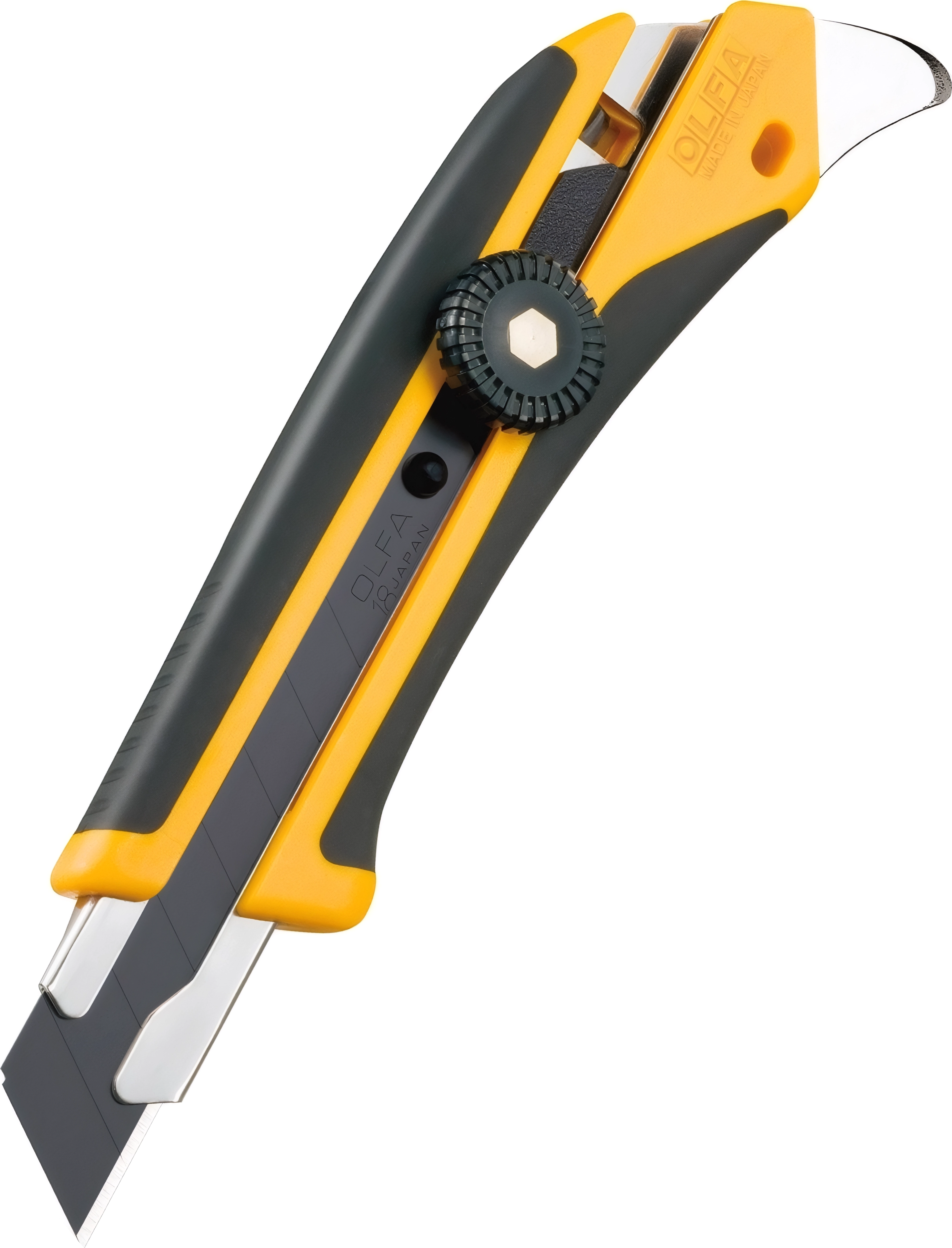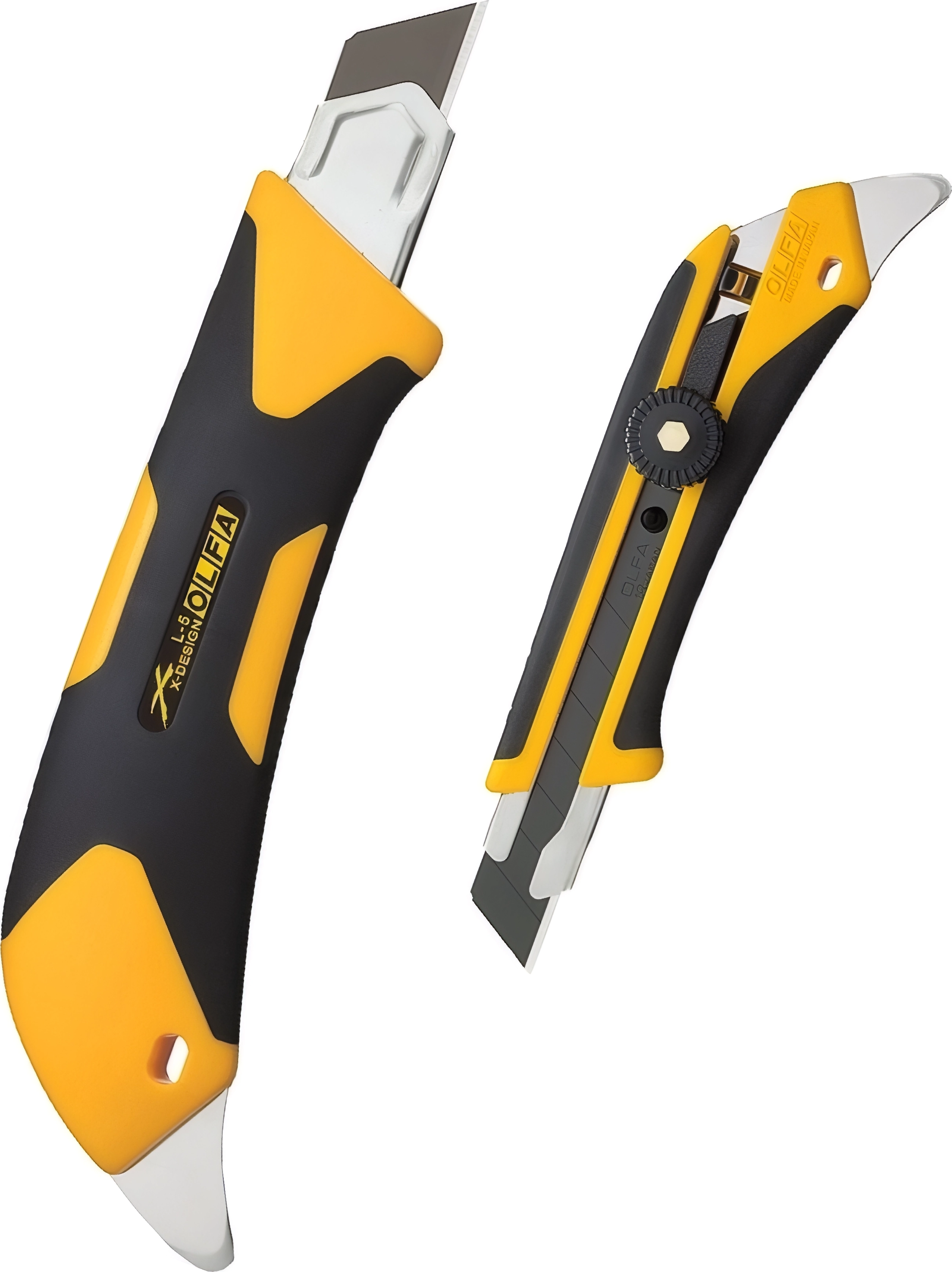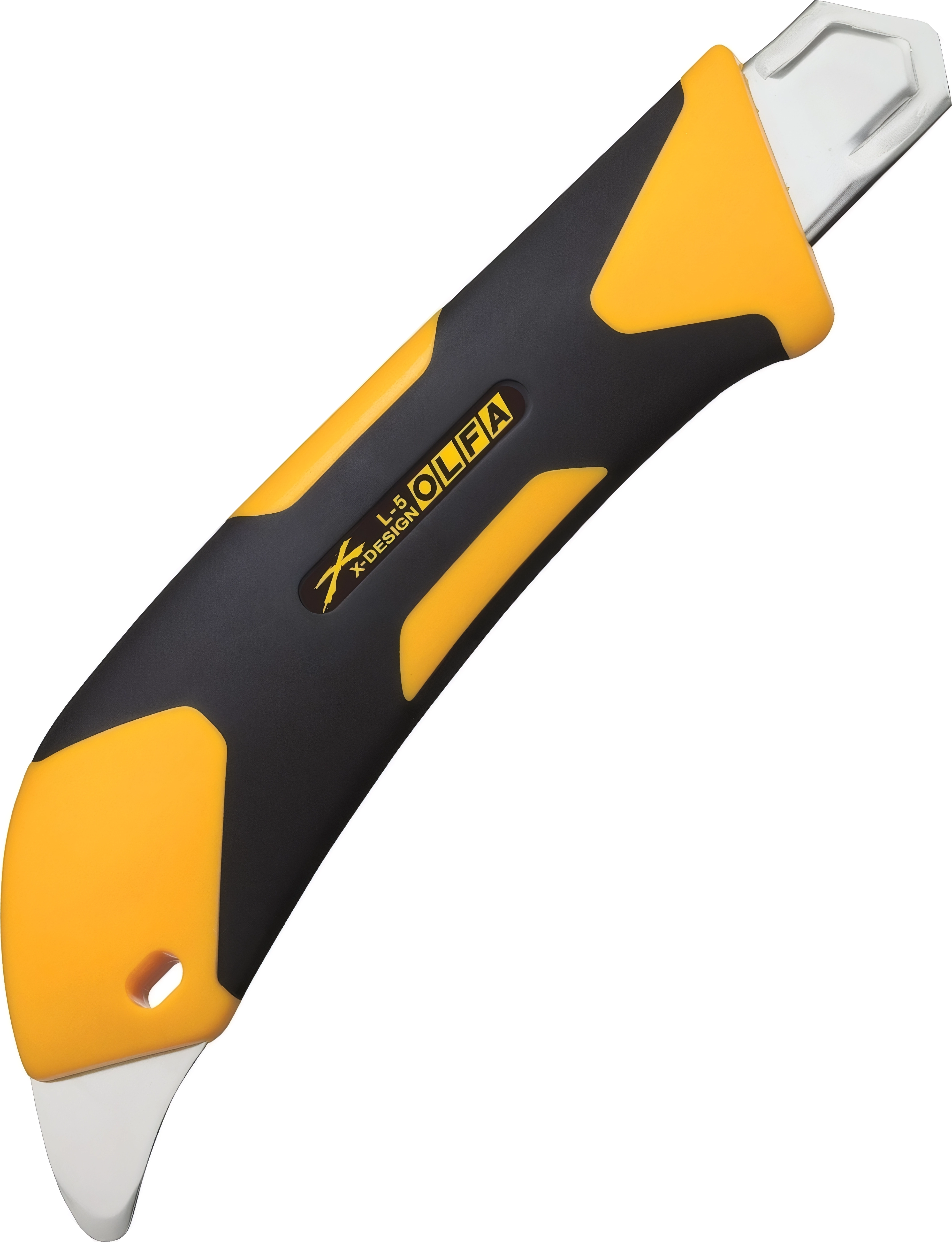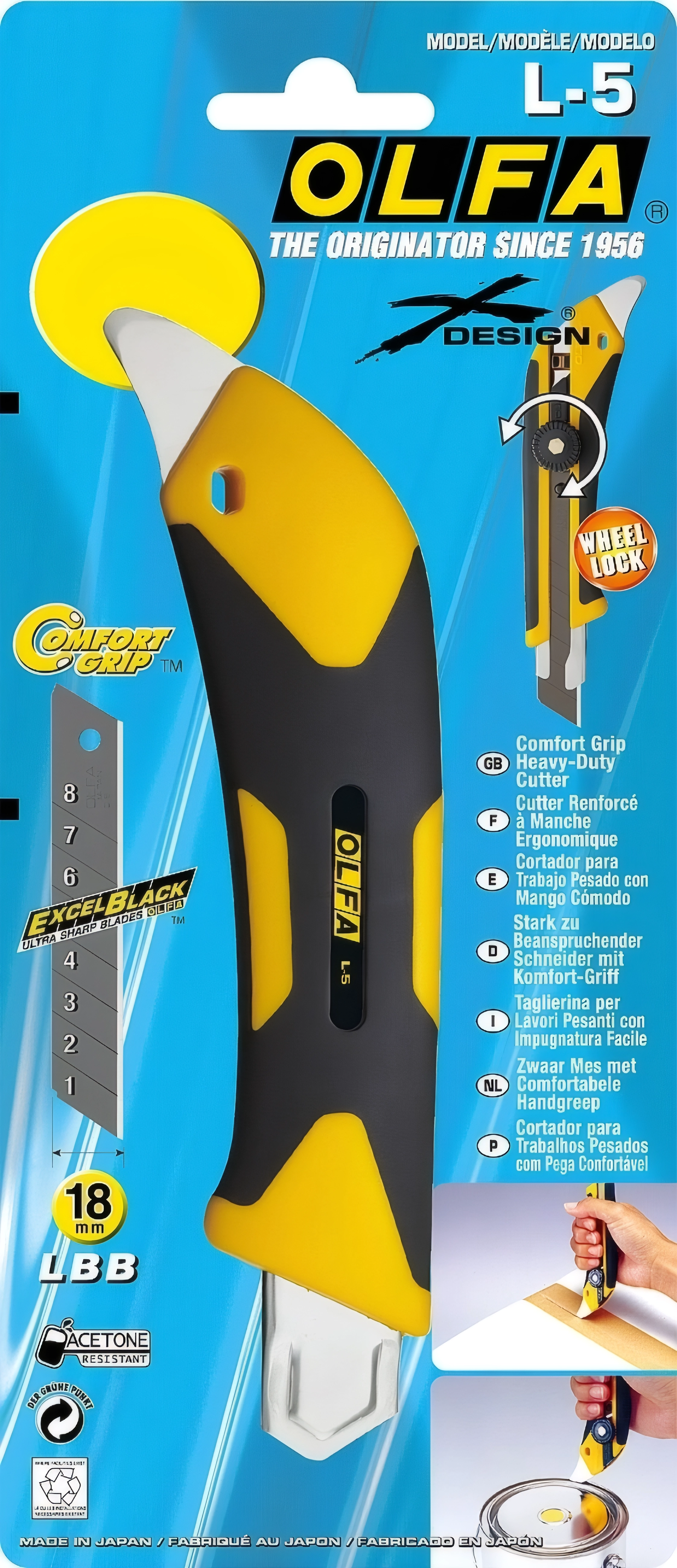 Универсальный нож OLFA L-5 серии X-design ComfortGrip с храповым механизмом и металлическим выступом. Легкий и простой в использовании оснащен эргономичной противоскользящей рукояткой устойчивой к кислотам, ацетону и маслам, усиленной фиберглассом. Эта комбинация обеспечивает удобный, надежный захват при выполнении самых сложных работ. Поставляется с черным лезвием LBB шириной 18 мм, которое на 25% острее стандартных лезвий OLFA. Просто отломите один из восьми сегментов, если лезвие затупилось. Полная замена происходит быстро и без дополнительных инструментов.