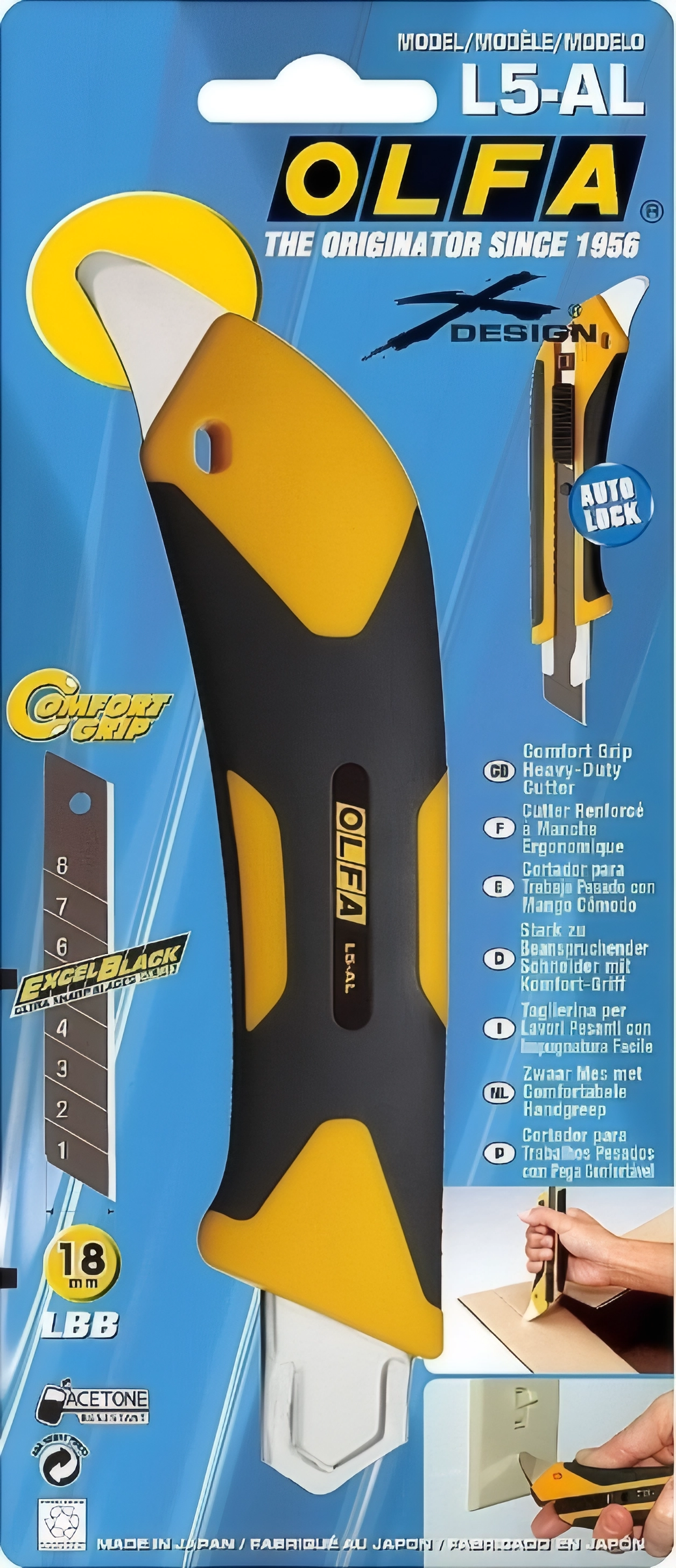 Универсальный нож OLFA L5-AL серии X-design ComfortGrip, с храповым механизмом и металлическим выступом. Легкий и простой в использовании оснащен эргономичной противоскользящей рукояткой устойчивой к кислотам, ацетону и маслам, усиленной фиберглассом. Эта комбинация обеспечивает удобный, надежный захват при выполнении самых сложных работ. Поставляется с черным лезвием LBB шириной 18 мм, которое на 25% острее стандартных лезвий OLFA. Просто отломите один из восьми сегментов, если лезвие затупилось. Полная замена происходит быстро и без дополнительных инструментов. Многоцелевой металлический выступ делает нож еще более практичным и удобным. Используйте выступ для любых задач, где нельзя использовать лезвие: для удаления герметика, открывания банок или снятия выпускных пластин. Это полезное дополнение гарантирует, что острые как бритва лезвия OLFA останутся чистыми и невредимыми.