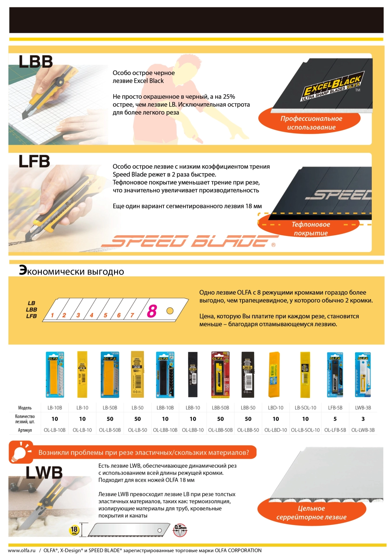 Используются в качестве сменных рабочих элементов в ножах с шириной направляющей пластины 18 мм. Применяются для разрезания различных материалов: линолеума, ковровых покрытий, гипсолитовых плит, гипсокартона, кровельных материалов, пластика, дерева