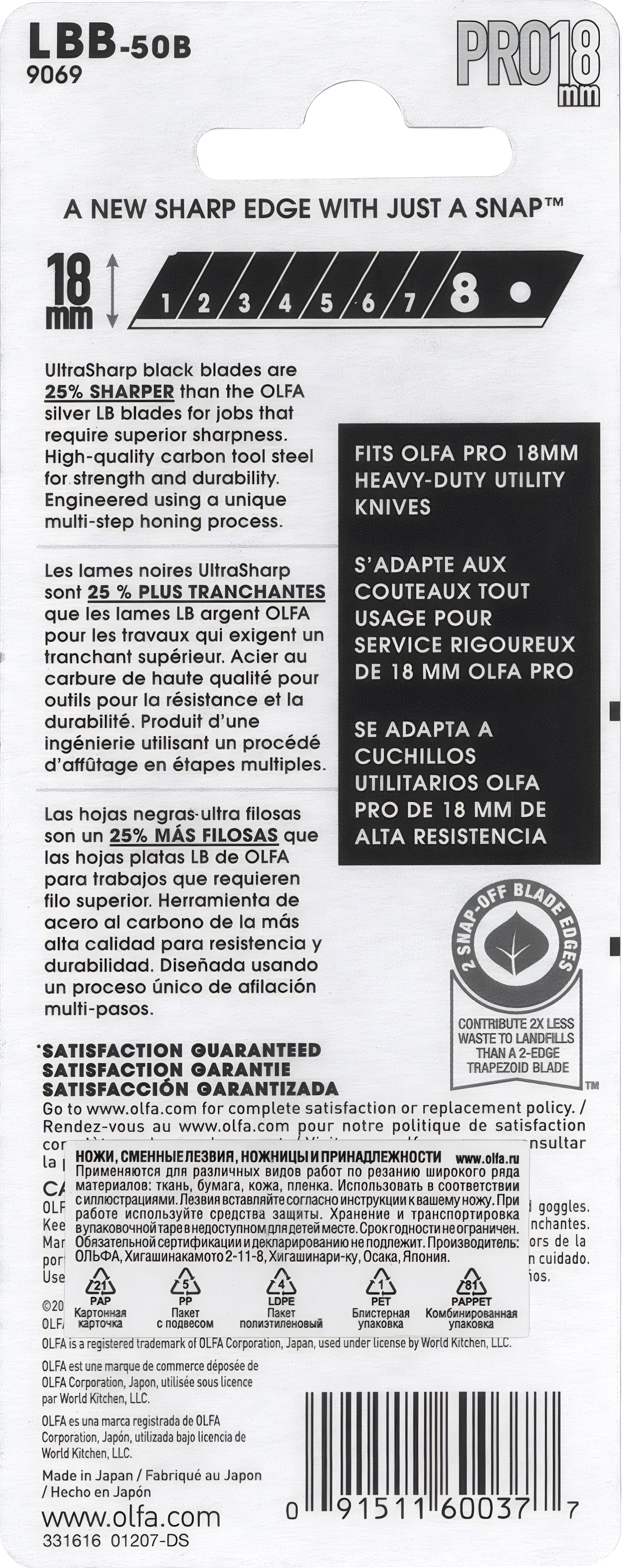 Сверхпрочные лезвия изготовлены из высококачественной японской инструментальной стали и профессионально заточены для обеспечения превосходной остроты и непревзойденной долговечности режущей кромки. При изготовлении лезвий серии «EXCEL BLACK» используется технология двойного затачивания, что даёт дополнительные 25% к остроте данного лезвия. Лезвия имеют глубокую и гладкую сегментную линию для легкого отламывания. Упакованы в удобный кейс для переноски и хранения.