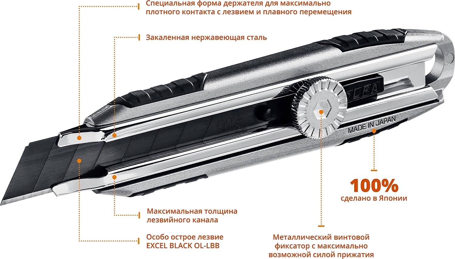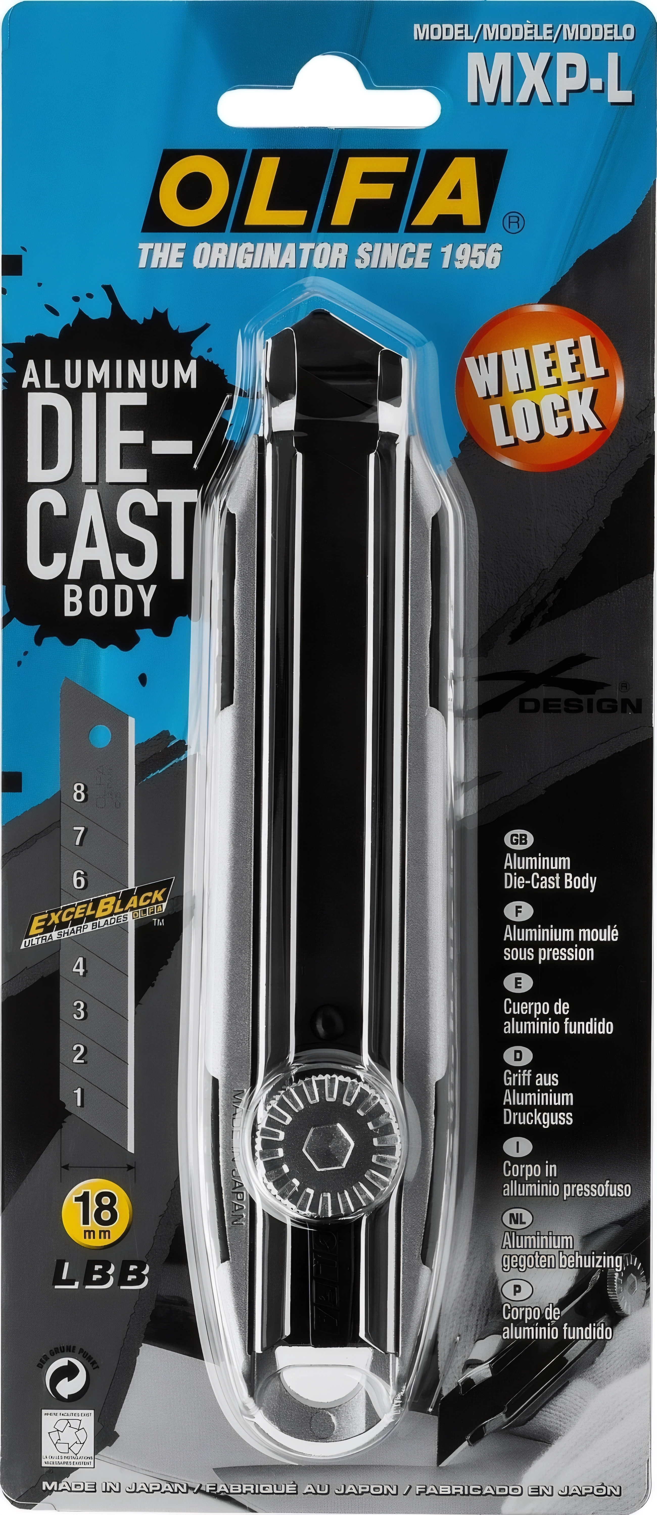 Нож из литого алюминия OLFA MXP-L для точного и уверенного реза. Корпус из нержавеющей стали надежно фиксирует лезвие, обеспечивая исключительную долговечность даже при непрерывном использовании. Ультра-острое черное сегментированное лезвие LBB шириной 18 мм на 25% острее стандартных лезвий OLFA, что делает этот универсальный нож выбором профессионалов.