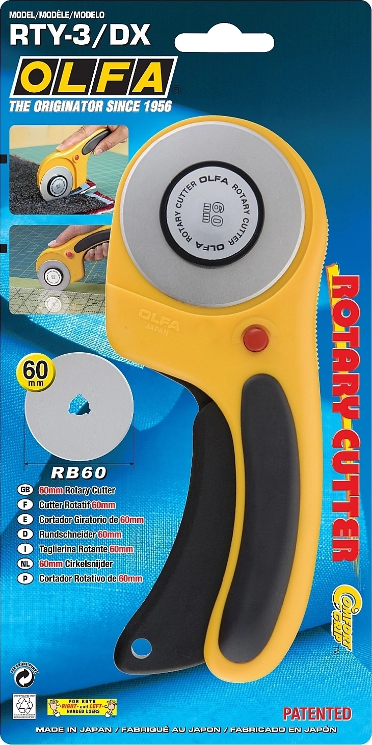 Эргономичный круговой нож OLFA RTY-3/DX может похвастаться высокой производительностью и безопасностью. Идеально подходит и для тонких, и для плотных тканей, включая флис, шерсть, кожу и т. д.