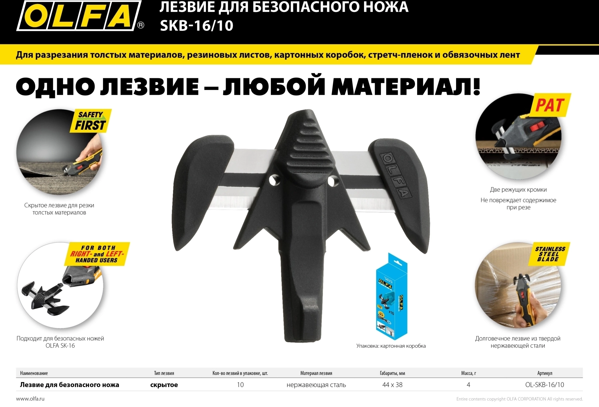 Сменное лезвие для ножей OLFA SK-16. Лезвие может разрезать толстые материалы, такие как ковер, резиновые листы, картонные коробки с двойными стенками, стретч-пленку и обвязочные ленты, удовлетворяя потребности интенсивных пользователей