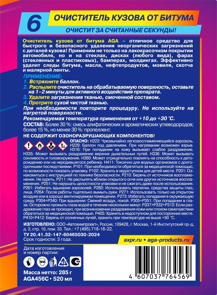 Очиститель кузова от битума AGA С6, 520мл (AGA456C)