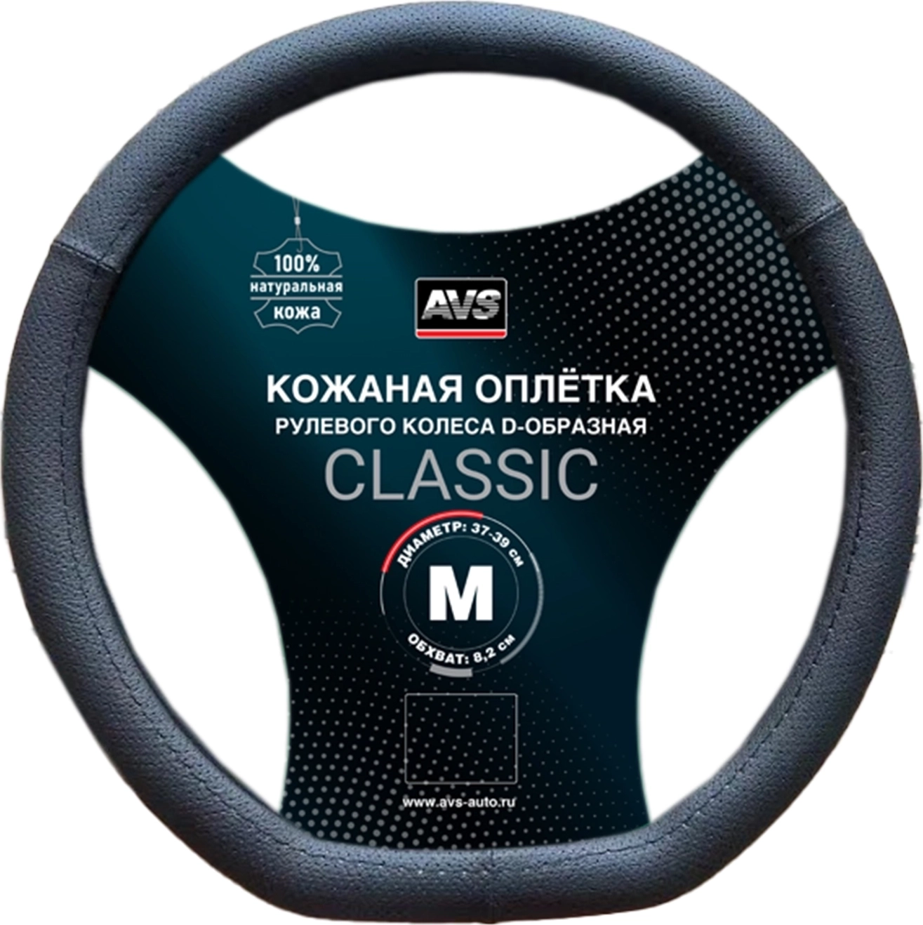 Оплетка на руль D-образная (нат. кожа) AVS DS-165M-B (размер M, черный) - Серия "Classic" арт. 117234