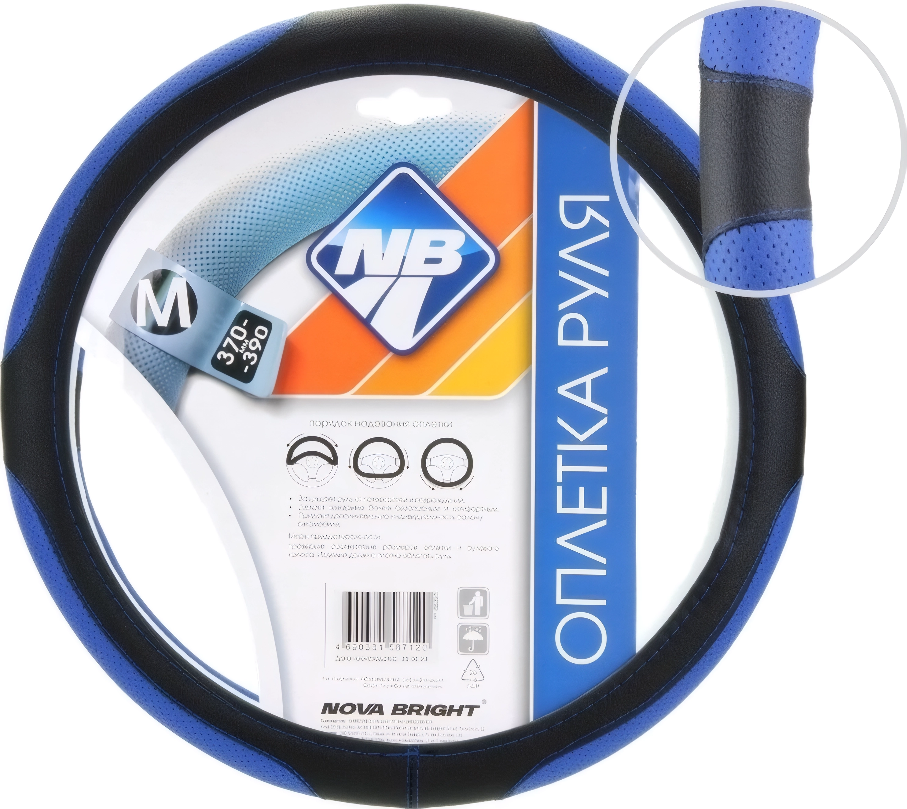 Оплетка на руль M (37-39см) экокожа черная с синими вставками, синяя строчка арт. 121570