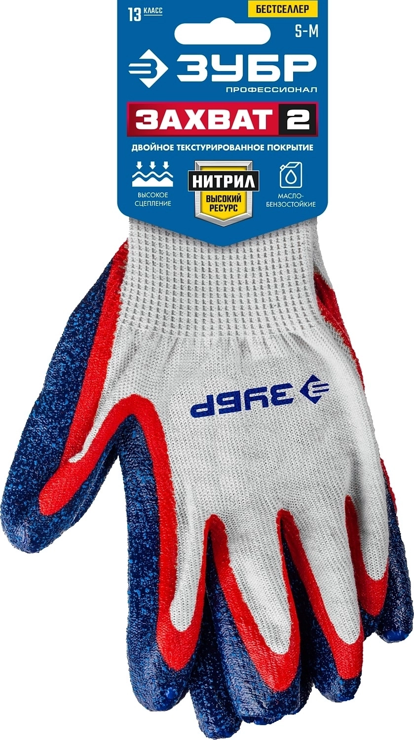 Перчатки х/б с двойным текстурированным нитриловым обливом ЗУБР ЗАХВАТ-2 S-M повышенная износостойкость 13 класс