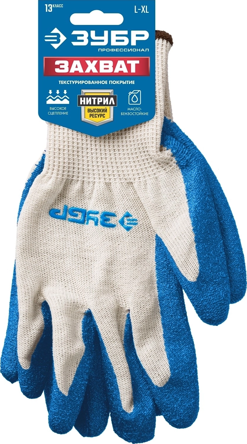 Перчатки х/б с текстурированным нитриловым обливом ЗУБР ЗАХВАТ L-XL повышенная износостойкость 13 класс