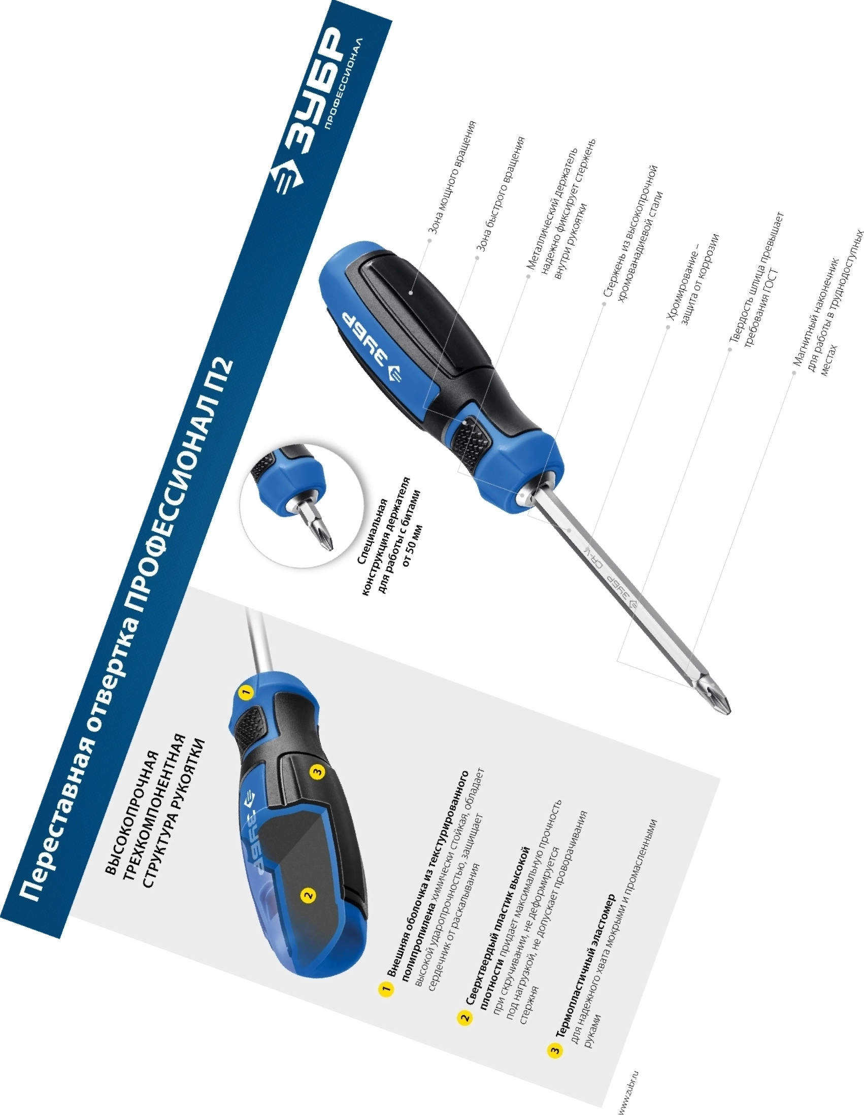 Отвертка с переставным стержнем выдерживает высокие нагрузки, благодаря высокой твердости наконечника и специальной закалке. Комфортная рукоятка обеспечивает твердый хват и удобство работы.