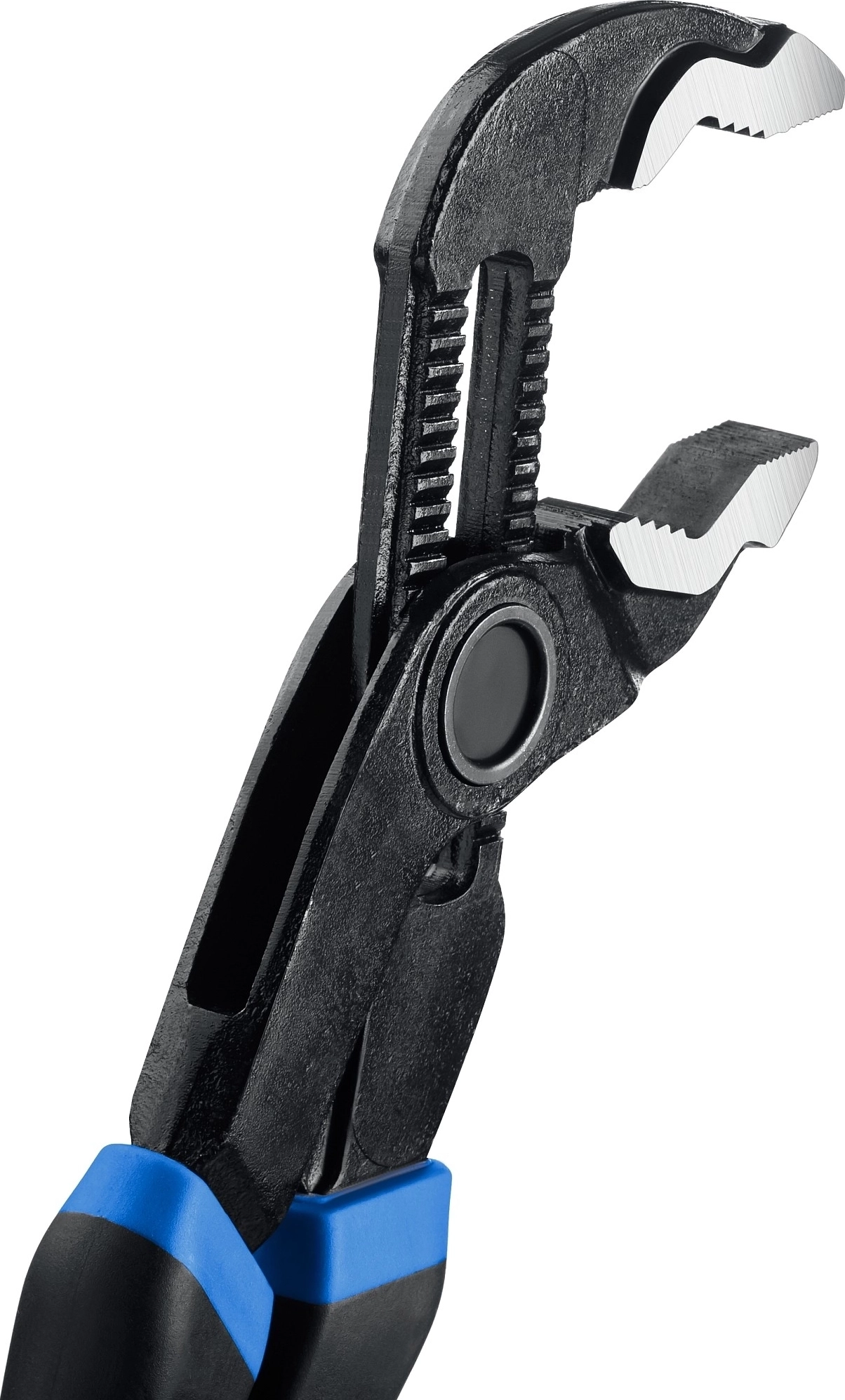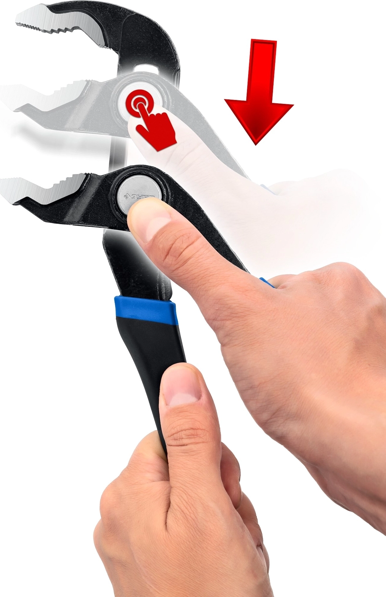 - Уникальная конструкция шарнира с кнопочным фиксатором обеспечивает быстрый подбор ширины зева.