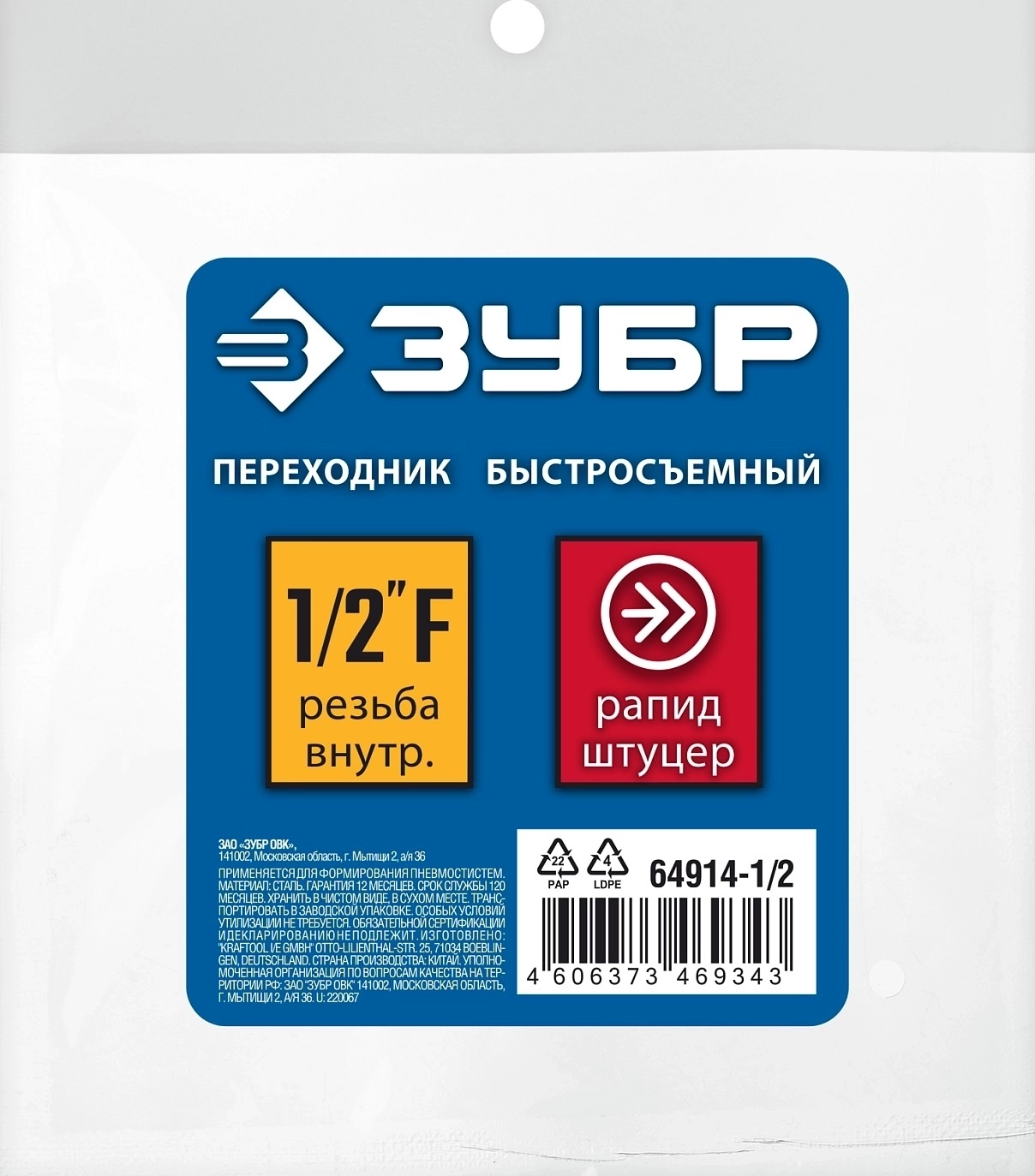 Переходник ЗУБР 1/2″F - рапид штуцер