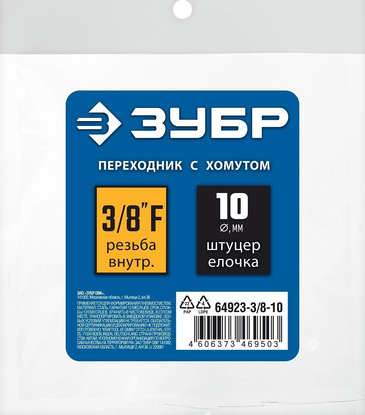 Переходник с обжимным хомутом ЗУБР штуцер ″елочка″ 10 мм - 3/8″F