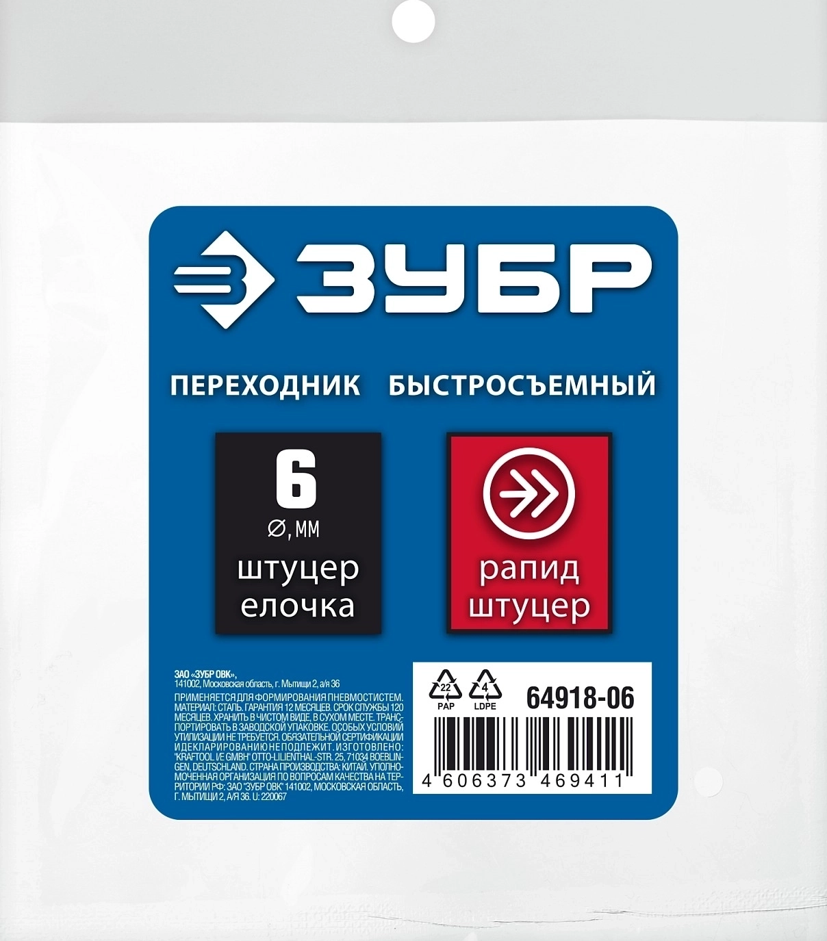Переходник с обжимным хомутом ЗУБР штуцер ″елочка″ 6 мм - рапид