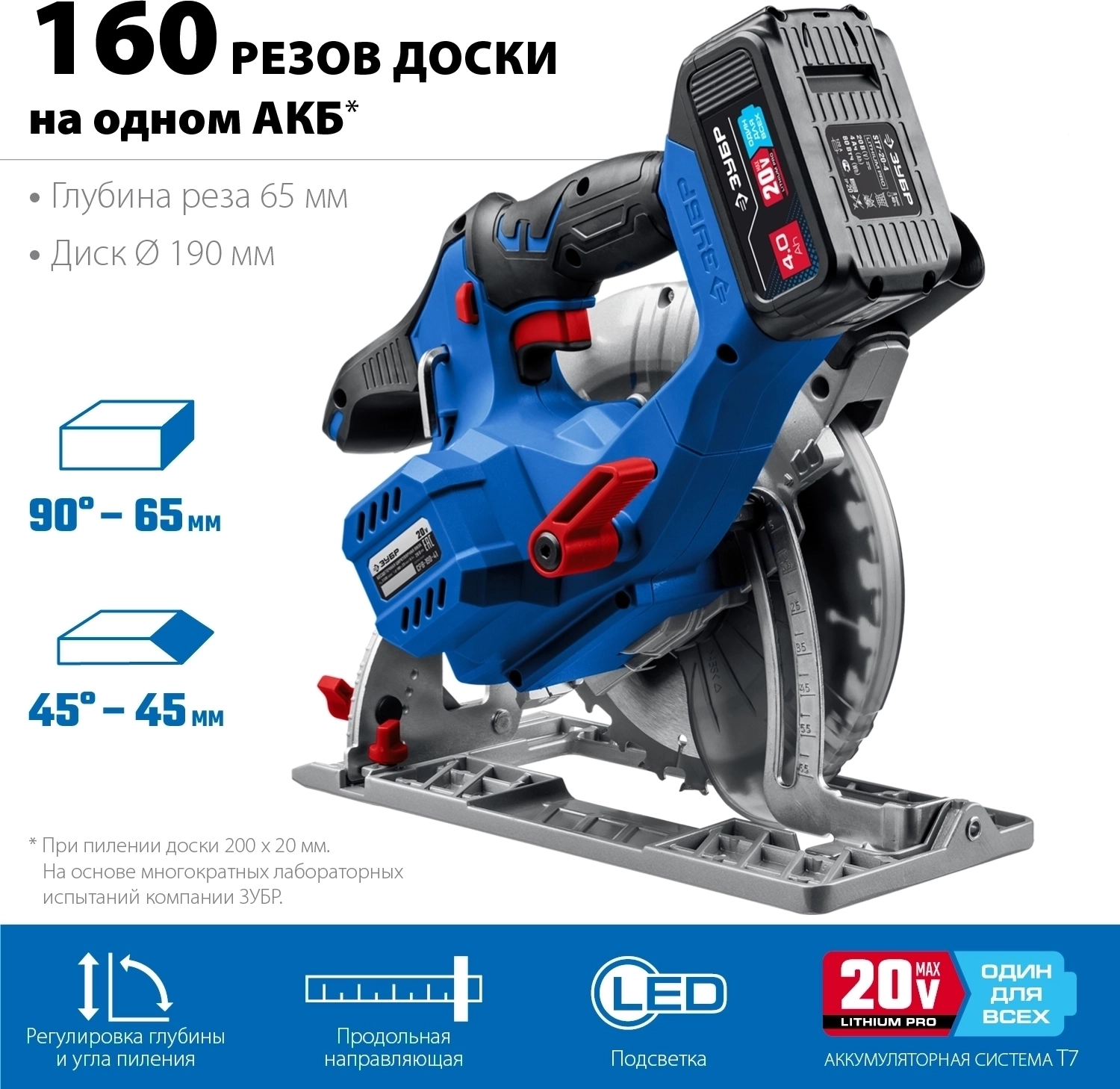 Пила циркулярная бесщеточная ЗУБР Т7 20 В d190 мм 1 АКБ 4 А·ч