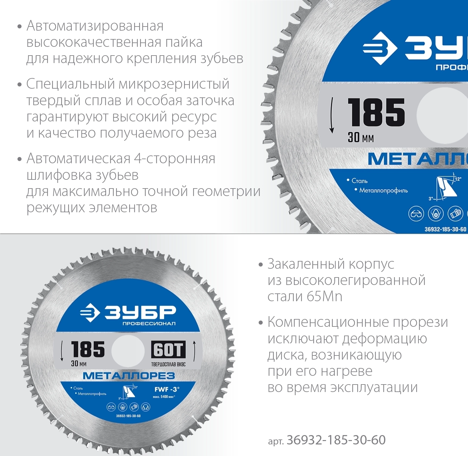 Пильный диск по металлу и металлопрофилю ЗУБР Металлорез 185 х 30 мм 60Т