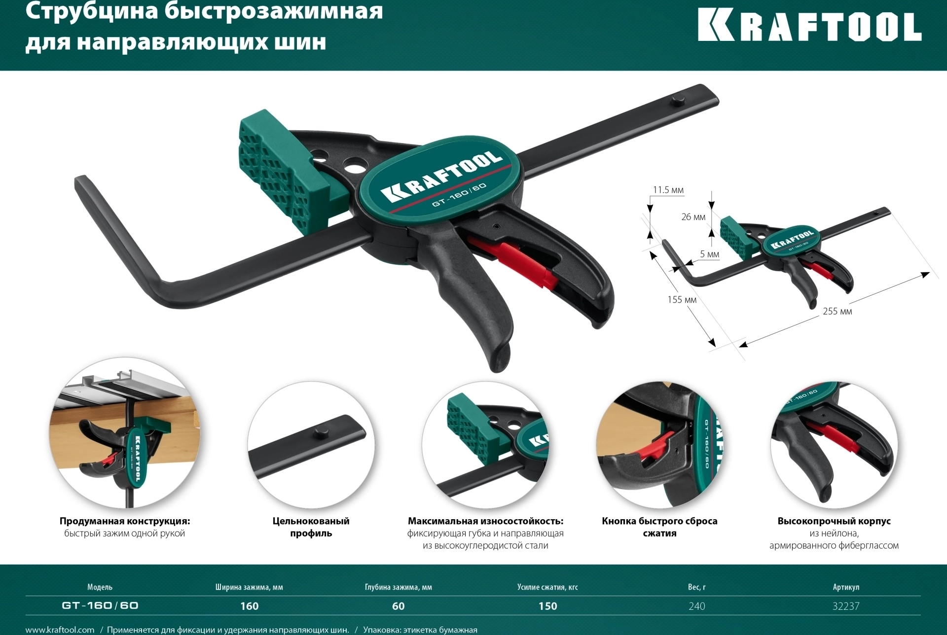 Пистолетная струбцина KRAFTOOL GT-160/60, 160/60 мм, универсальная, быстрозажимная, в T-track