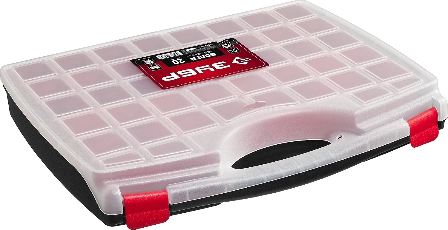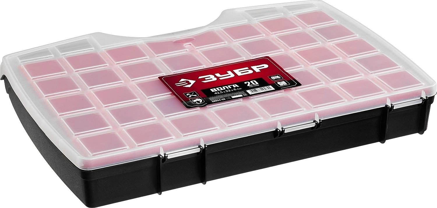 Пластиковый органайзер с 20 съемными лотками ЗУБР ВОЛГА-20, 425 х 330 х 60 мм