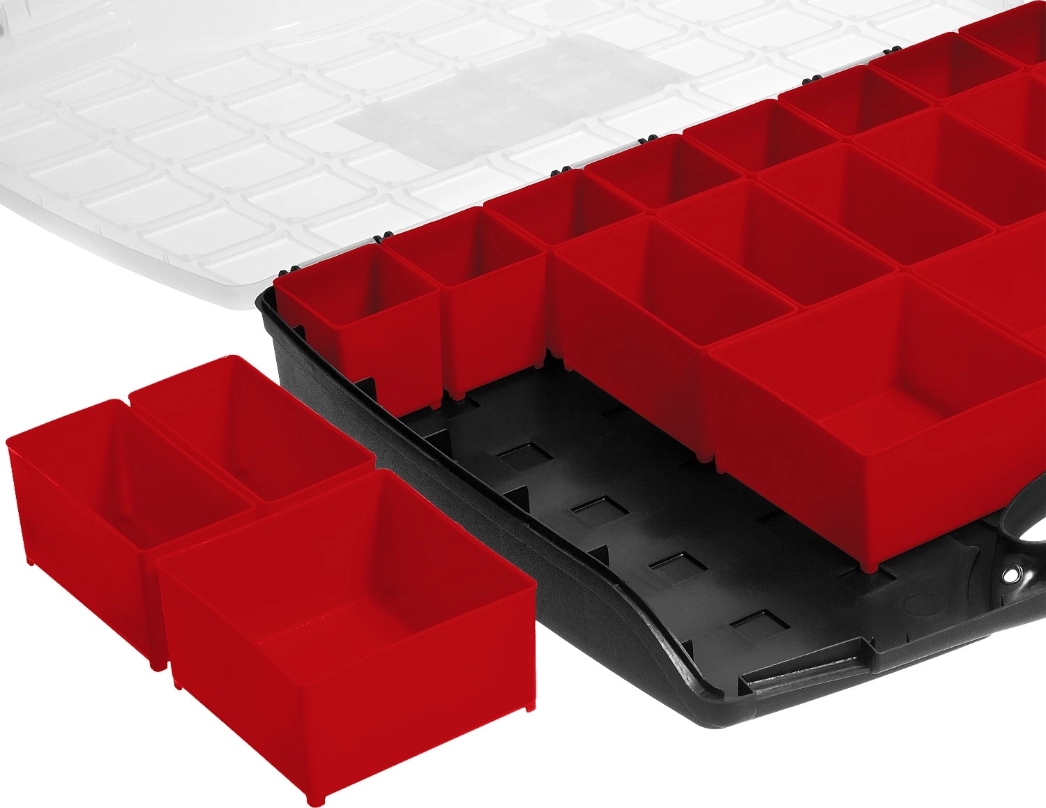 Съемные лотки органайзера позволяют организовать удобное хранение и переноску принадлежностей к ниструментам