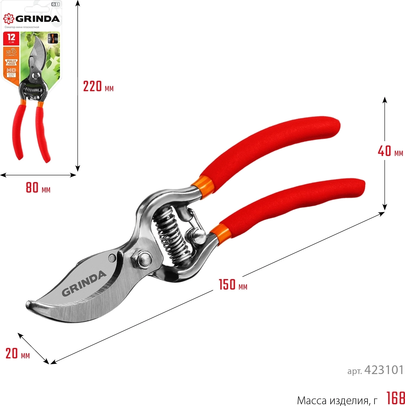 Плоскостной мини-секатор GRINDA G-1, 150 мм, цельнокованые лезвия, стальные рукоятки, покрытие ПВХ